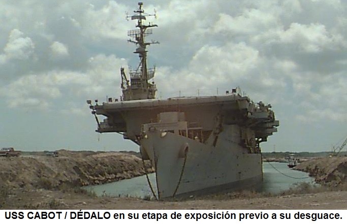 Stricken from the Spanish Navy List, 5 Aug 1989, at New Orleans, and donated to a private organization for preservation as a museum ship. Plans to memorialize her, however, met with no success in subsequent years (see Hazegray & Underway); she was sold for scrapping in 1997 and towed to Port Isabel, TX (18 Oct), then to Brownsville (9 Aug 1998). Further efforts to preserve the last of the World War II CVLs failed, too, and stripping work began in Oct 2000; as of mid-2002, scrapping was nearing completion (visit USS Cabot Museum for more information and photos).| Click On Image
