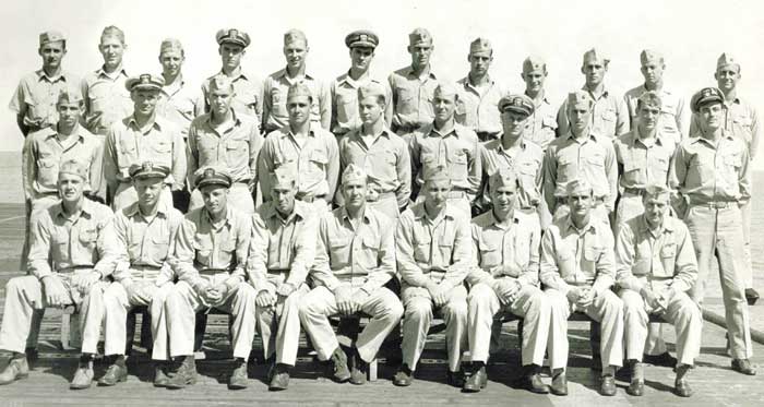 48k | Last photo of Figthing Squadron (VF) 31 "Flying Meataxers" aboard USS Cabot (CVL-28). With 165.6 victories, VF-31 was the highest-scoring CVL (light carrier) squadron, and the 7th Navy squadron. With half the planes and pilots, it equalled or even outscored some VF squadrons aboard Essex-class carriers. They had the highest kill ratio per pilot of any squadron in the U.S. Navy, a record that stands today. Cabot carried Air Group 31 from the time of her shakedown cruise until they were rotated out of active duty in October of 1944. Air Group 31 was replaced by Air Group 29, that served aboard Cabot until 11 July 1945. AG31 was in turn relieved by Air Group 32, that served for the last six weeks until the end of hostilities. VF-31's second cruise, aboard USS Belleau Wood (CVL-24) in July 1945, produced only three days of air combat, but added 19 kills to their score. (Partial text from U.S. Navy Fighter Squadrons in World War II, by Barrett Tillman.) |