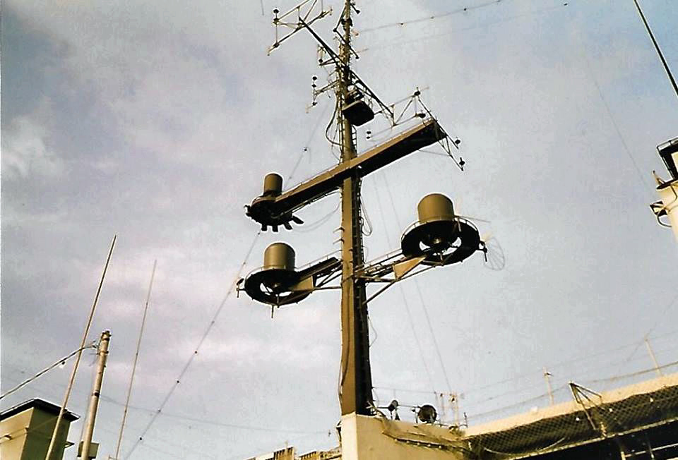667k | A view of the island of USS Cabot (CVL-28). USN photo. Judging from Air Group 29's (VF-29 & VT-29) scoreboard this picture was probably taken in October (or perhaps November) 1944. The curved antenna of the surface search SG radar is seen on the raised circular platform. Forward of and below it is the SC-2 air search radar antenna. A second air search radar (SK) was installed on a stub mast between the pairs of uptakes—all fleet carriers were fitted with two air search sets as insurance against the failure of one of them in combat, and the wide separation of both main radars aboard CVLs often resulted in better radar performance than that enjoyed by the heavier and CVs. |