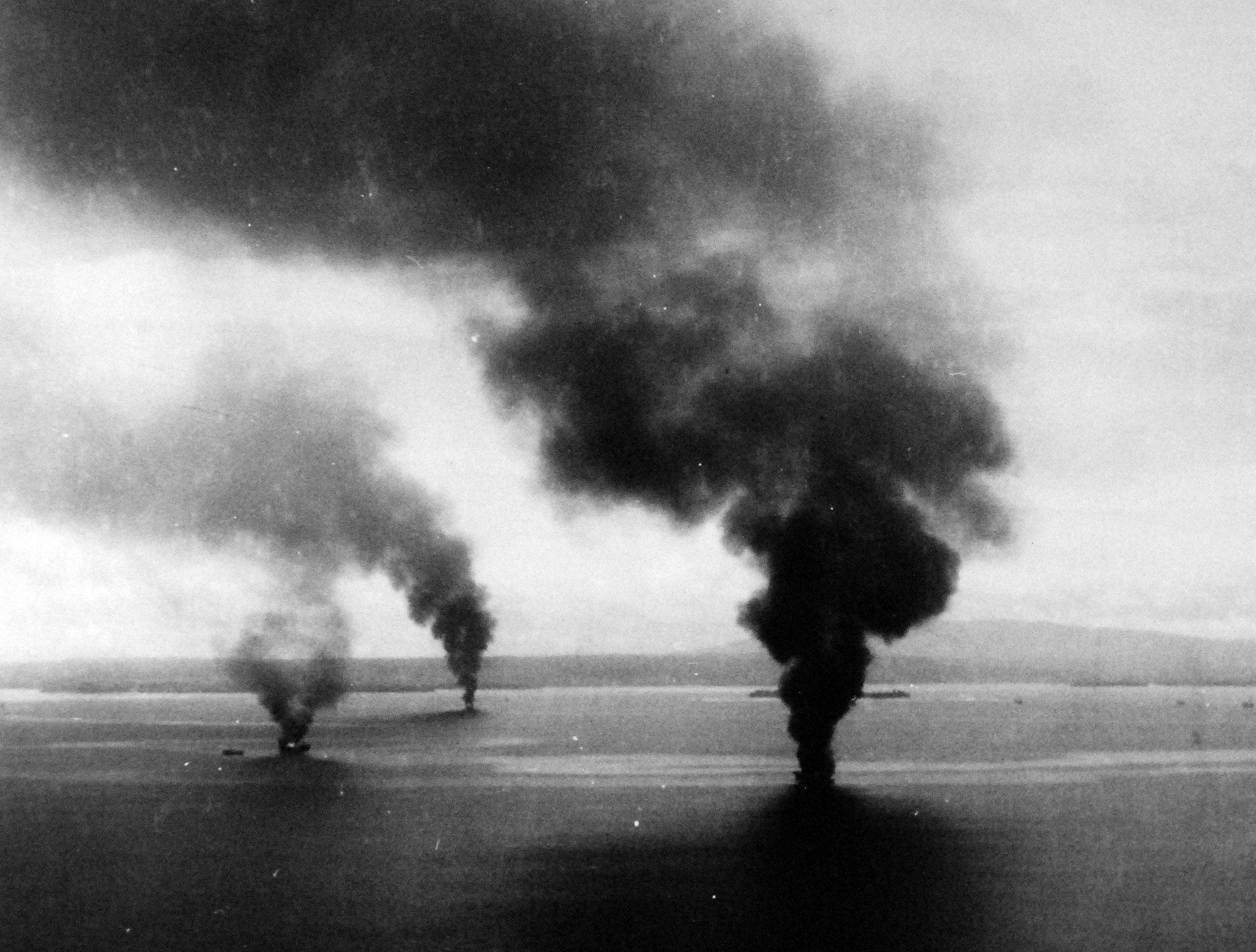 508k | Japanese ships burning from bomb drops near Bisling Bay off Sanco Point, Philippine Islands. Photographed by USS Cabot (CVL-28), 9 September 1944. NS0228aa: Official U.S. Navy Photograph, now in the collections of the National Archives and Records Administration, # 80-G-263189. NS0228aaa: Official U.S. Navy Photograph, now in the collections of the National Archives and Records Administration, # 80-G-263192. |