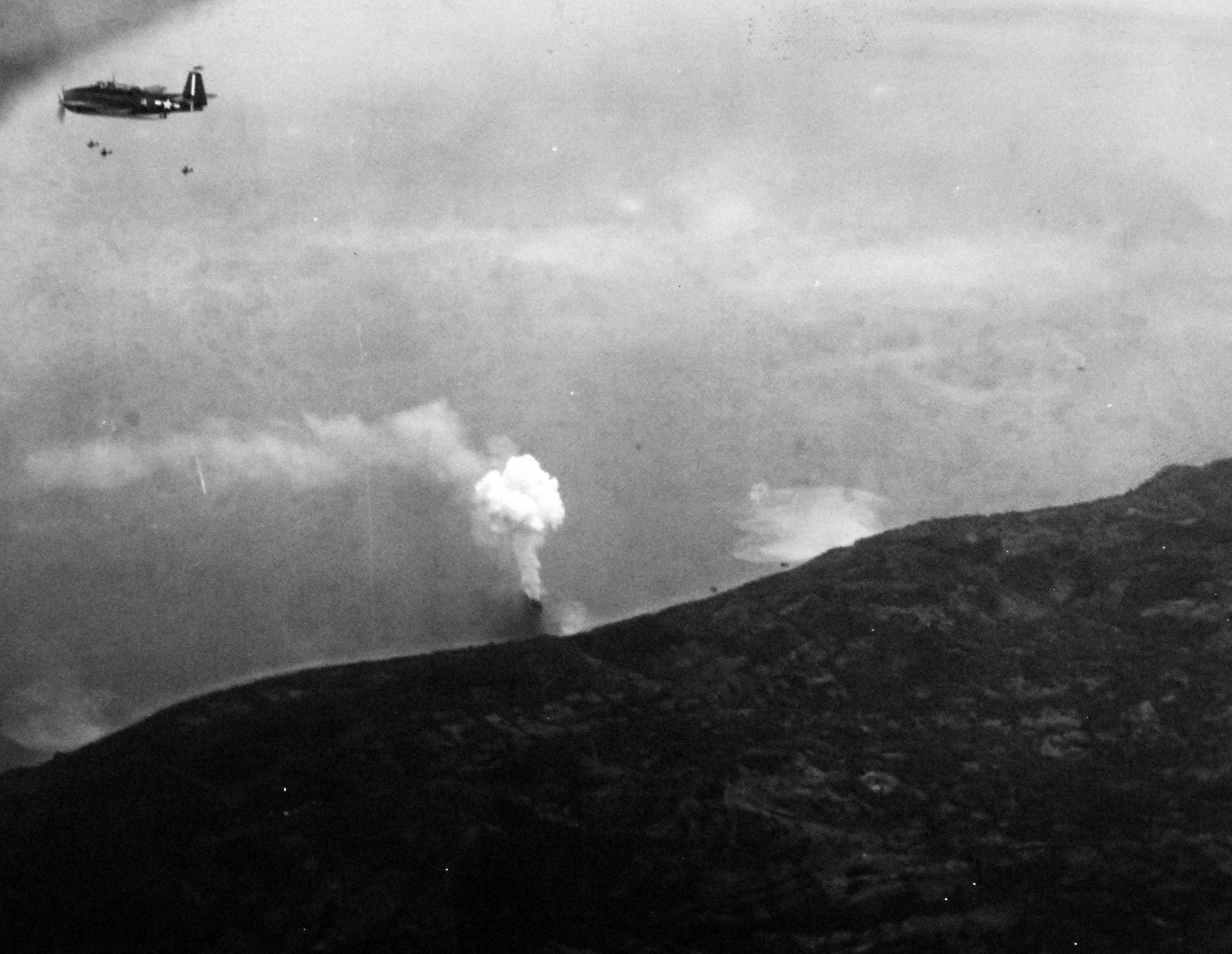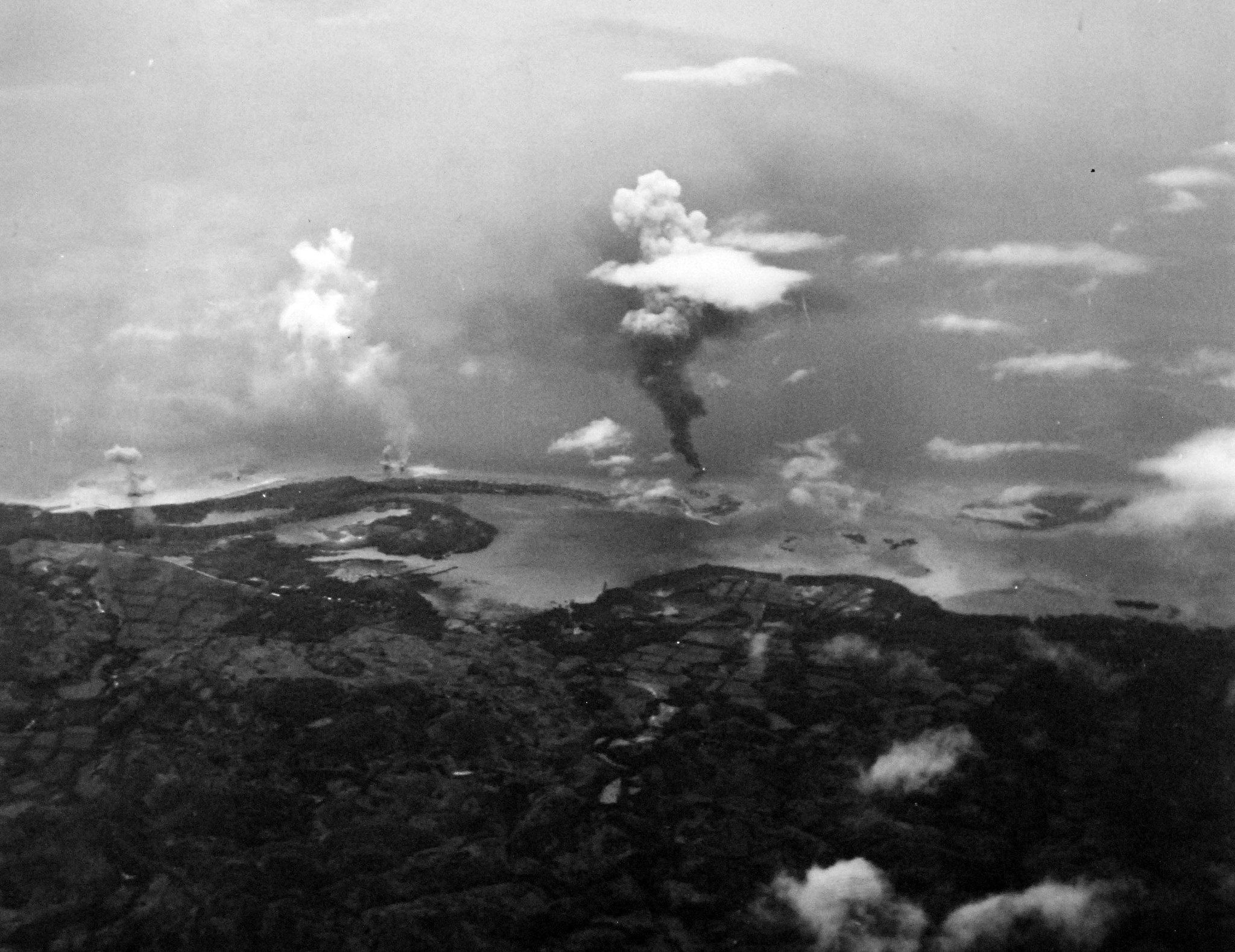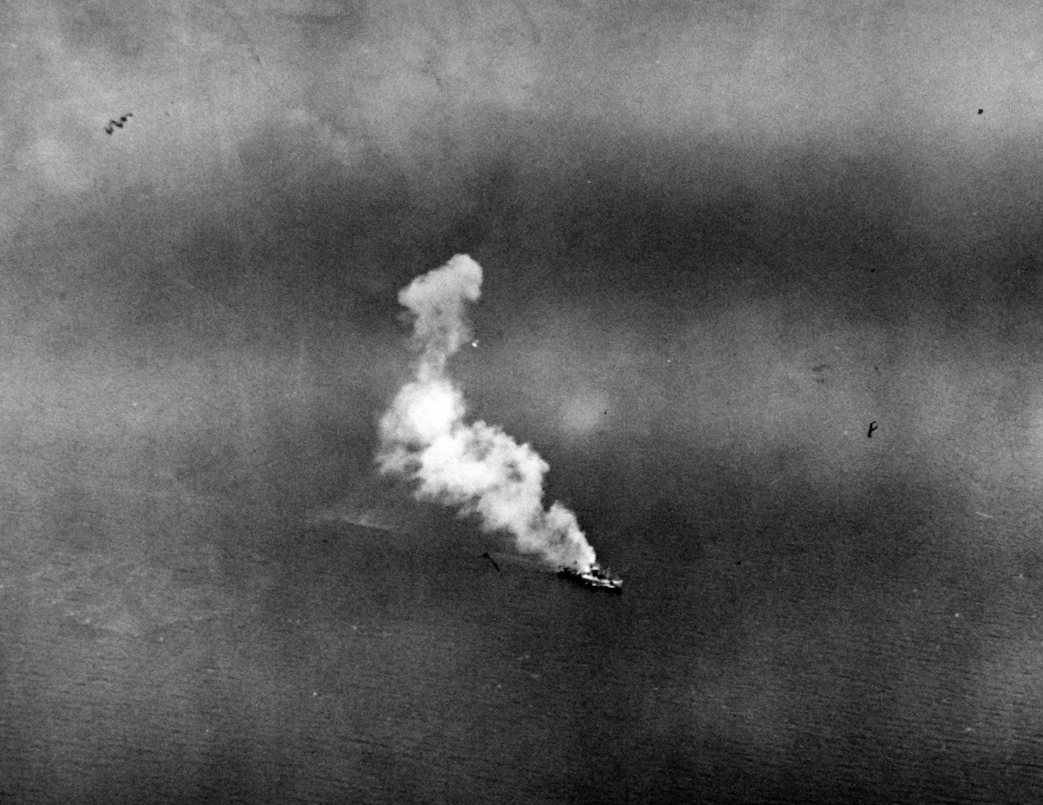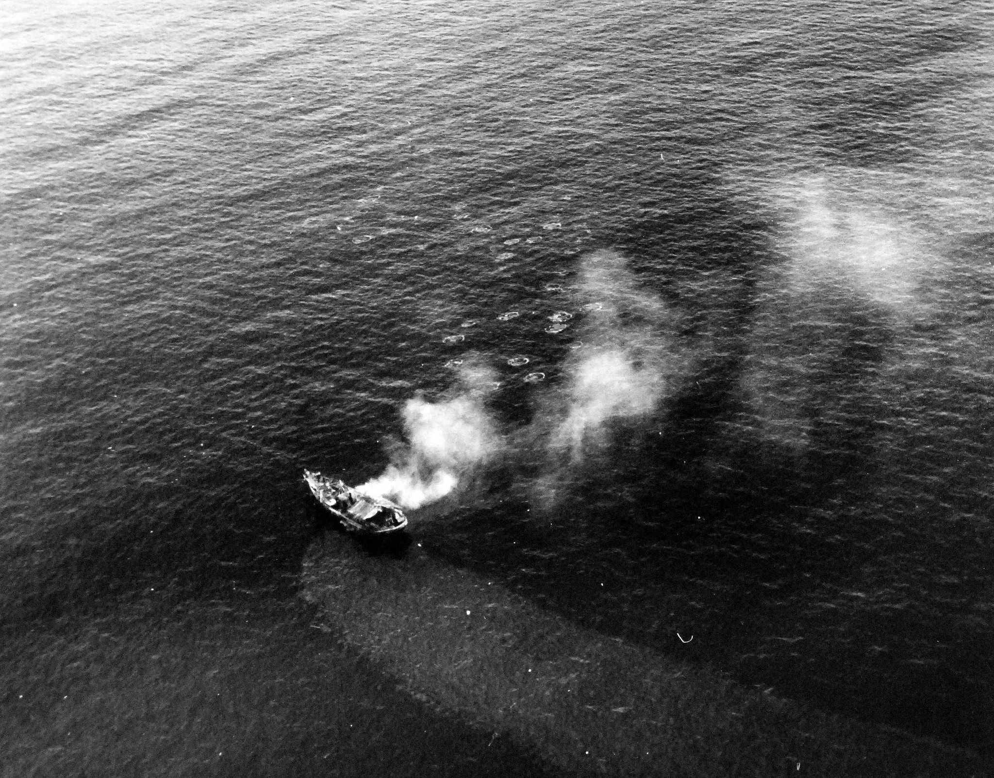 747k | Japanese cargo ship burning from hit by USS Cabot (CVL-28) aircraft. Official U.S. Navy Photograph, now in the collections of the National Archives and Records Administration, # 80-G-263203. |