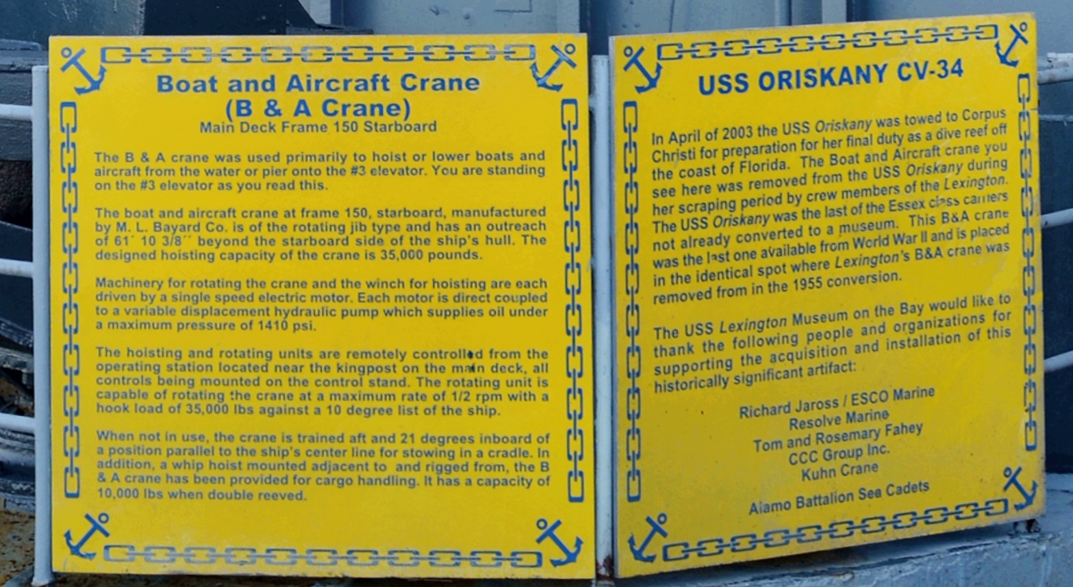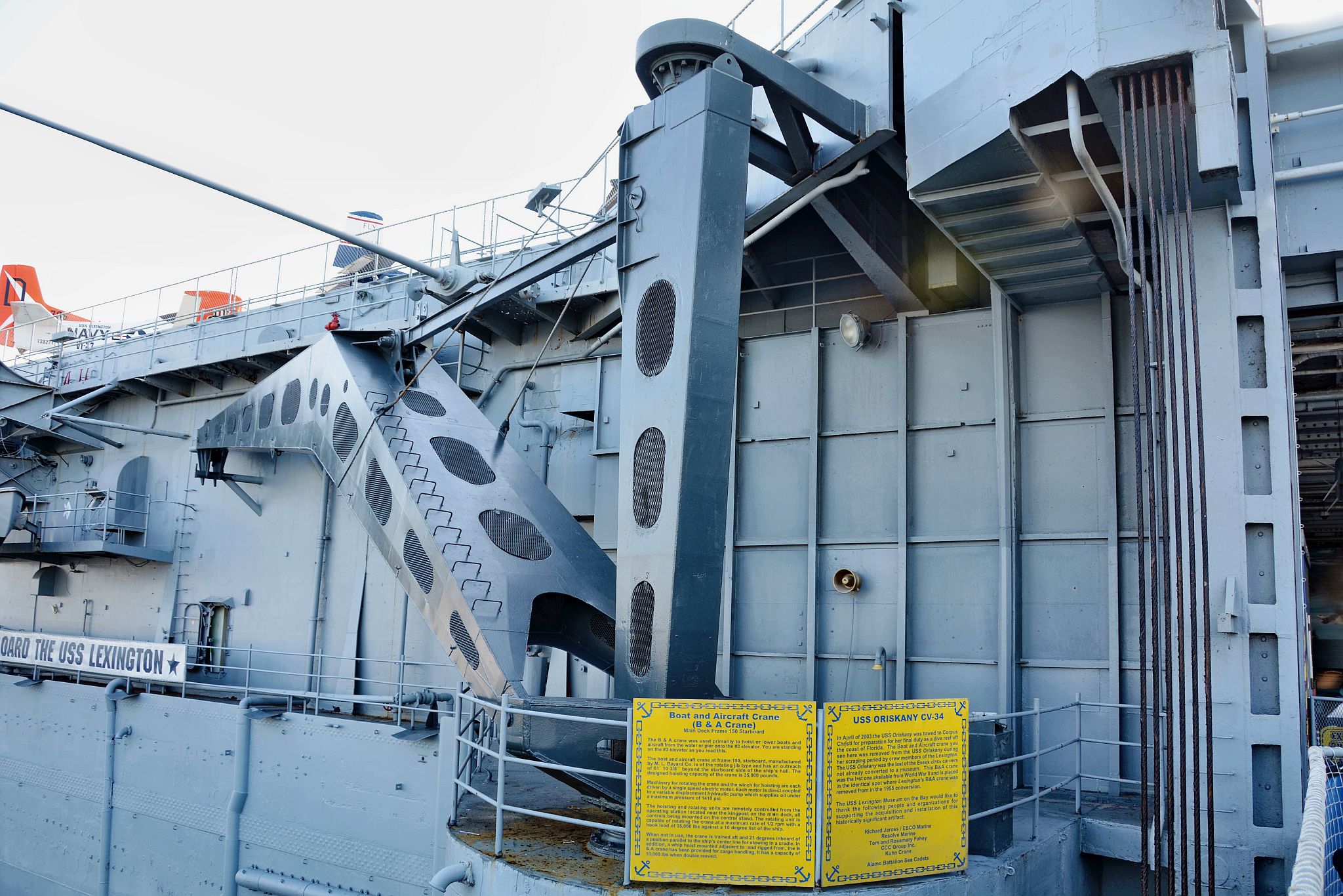 521k | The B&A crane was used primarily to hoist or lower boats and aircraft from the water or pier on the #3 elevator. This B&A crane, now aboard the USS Lexington Museum, was the last one available from World War II, was recovered from USS Oriskany (CV-34) and placed in the identical spot where Lexington's B&A crane was removed from in the 1955 conversion. |