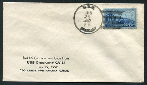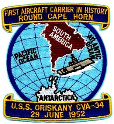 48k | NS023417: "First Aircraft Carrier in History Round Cape Horn." Commissioned in September 1950, Oriskany deployed to the Mediterranean Sea between May and October 1951 and steamed around Cape Horn to join the Pacific Fleet in May 1952. She made one Korean War combat cruise, from September 1952 to May 1953. (Note that her hull number was actually CV-34 on 29 June 1952: she was redesignated CVA-34 on 1 October that year). NS023417a: "First US Carrier around Cape Horn, USS Oriskany CV 34, June 29, 1952, Too large for Panama Canal" |