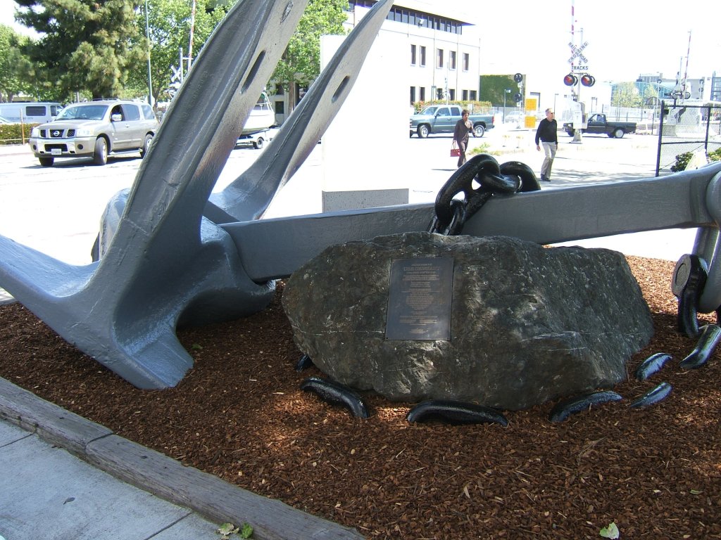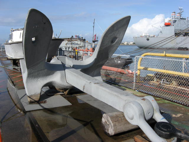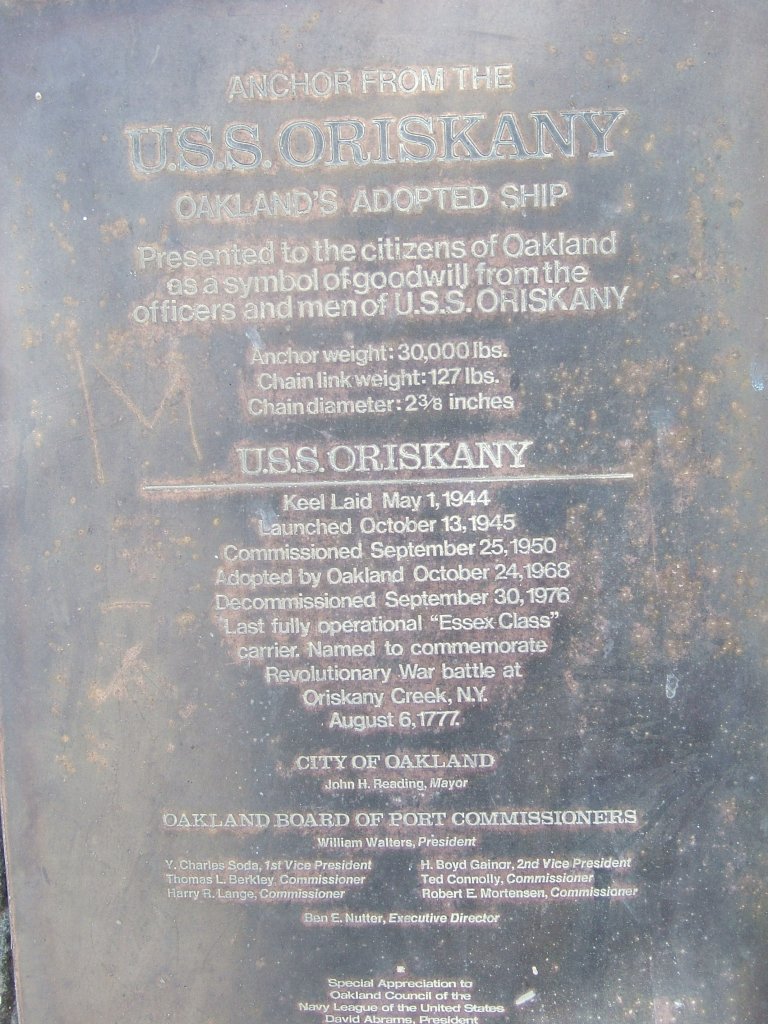 177k | One of USS Oriskany's anchors. It was located in Jack London Square, on the Oakland estuary in Oakland, CA. In August 2012 it was moved aboard the USS Hornet Museum in Alameda. In early 2014, Al Smith, a volunteer from the Museum, told Robert that the Oriskany's anchor would become Hornet's port anchor, as she only has a single starboard anchor (Al has volunteered since 1995, even before the Museum was a reality). |