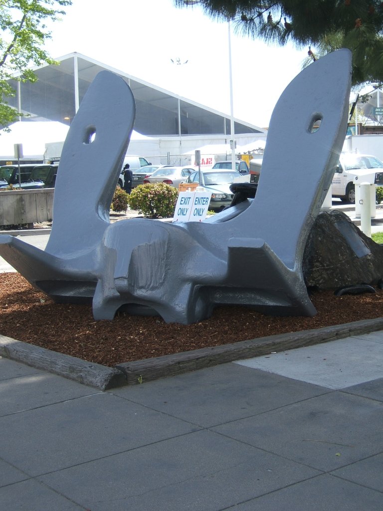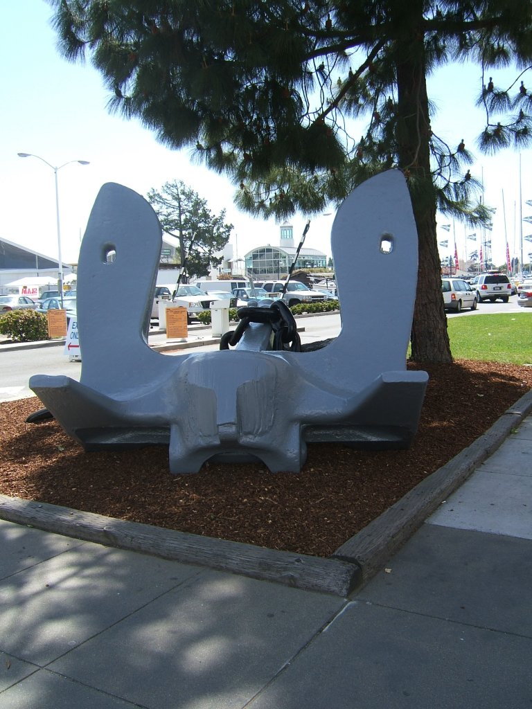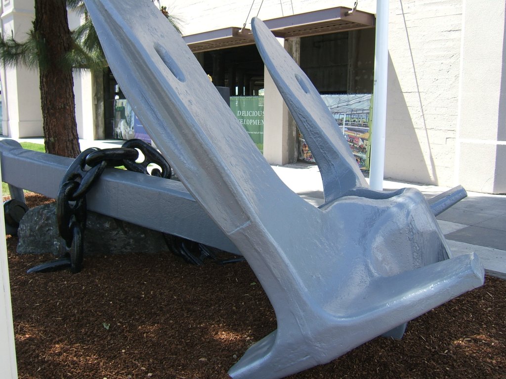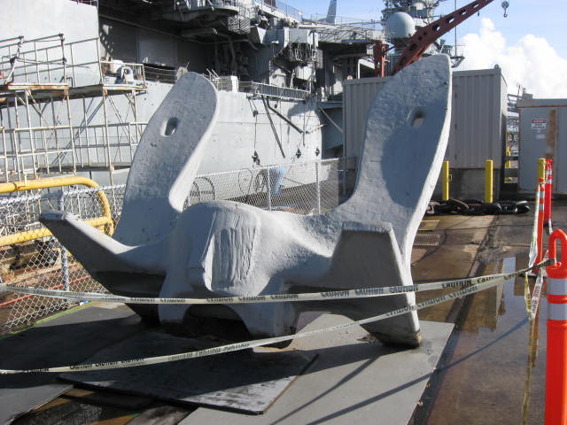 83k | Oriskany's anchor on the pier, alongside the USS Hornet Museum in Alameda. (See above.) |