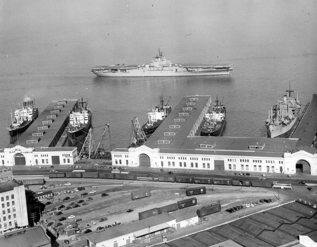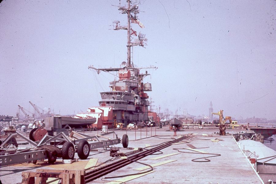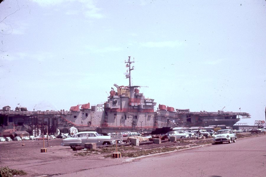 99k | Undated photo of Antietam at Hunters Point, San Francisco, in the early 1950s—at least before August 1952, when she left for the East Coast to receive her angle deck. It could be when she was reactivated for service in Korea. Source: San Francisco Naval Shipyard – Hunters Point, Historical Shipyard Photographic Collection 1904–74 NARA Pacific Region (San Francisco). |