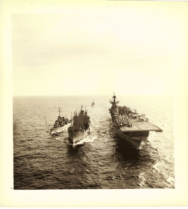 125k | USS Antietam (CV-36) alongside oiler USS Chiwawa (AO-68), 6 September 1945, operating off Korea in Task Force 72. This image shows the added structure on the starboard face of the island. From a USS Chiwawa web site. |