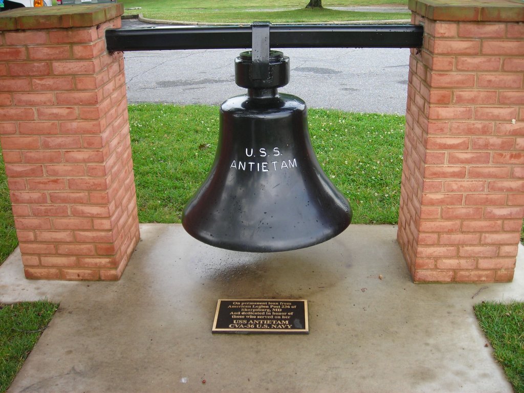 168k | USS Antietam (CV-36/CVA-36/CVS-36) ship's bell, as seen at the Antietam National Battlefield. Photo taken on 5 July 2008. "On permanent loan from American Legion Post 236 of Sharpsburg, MD |