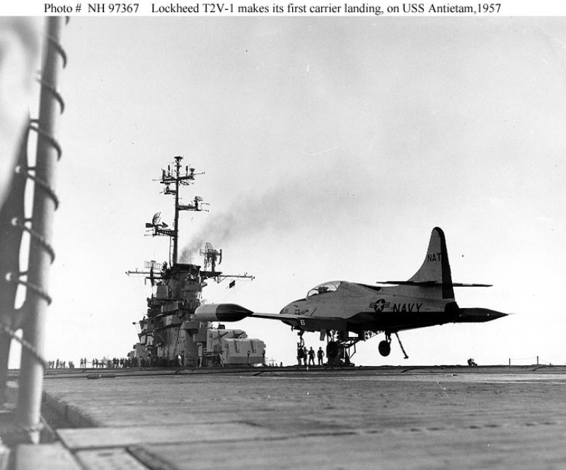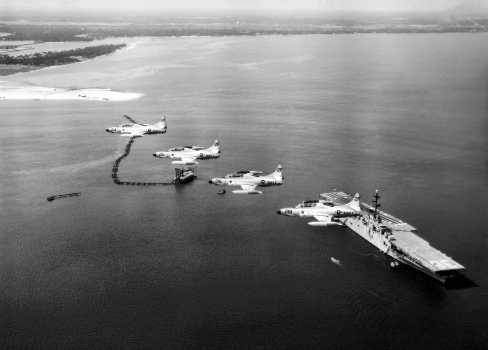 677k | Four U.S. Navy Lockheed T2V-1 Seastar trainers of Basic Training Group (BTG) 9 from Naval Air Station Pensacola, Florida, in formation over USS Antietam (CVS-36) at anchor in Pensacola Bay. Photo dated 14 June 1959. BTG-9 was redesignated Training Squadron (VT) 4 on 1 May 1960. National Naval Aviation Museum photo, # 1996.488.168.027. |