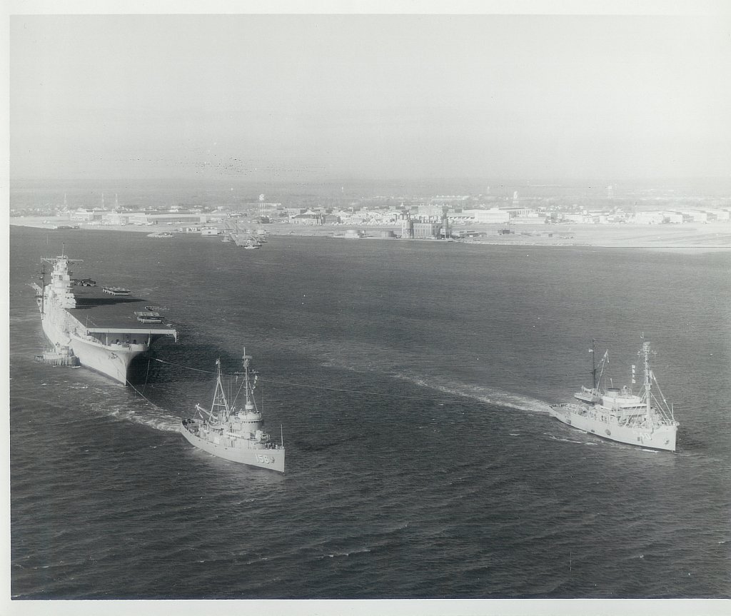 169k | Fleet ocean tug USS Luiseno (ATF-156), right, assisted by rescue and salvage ship USS Hoist (ARS-40), towed ex-USS Antietam from Quonset Point, RI, to Philadelphia, PA. Photos come from the Photographic Laboratory aboard the repair ship USS Cadmus (AR-14) and are dated 7 February 1969 (photo # AAF-2380-11-68). |