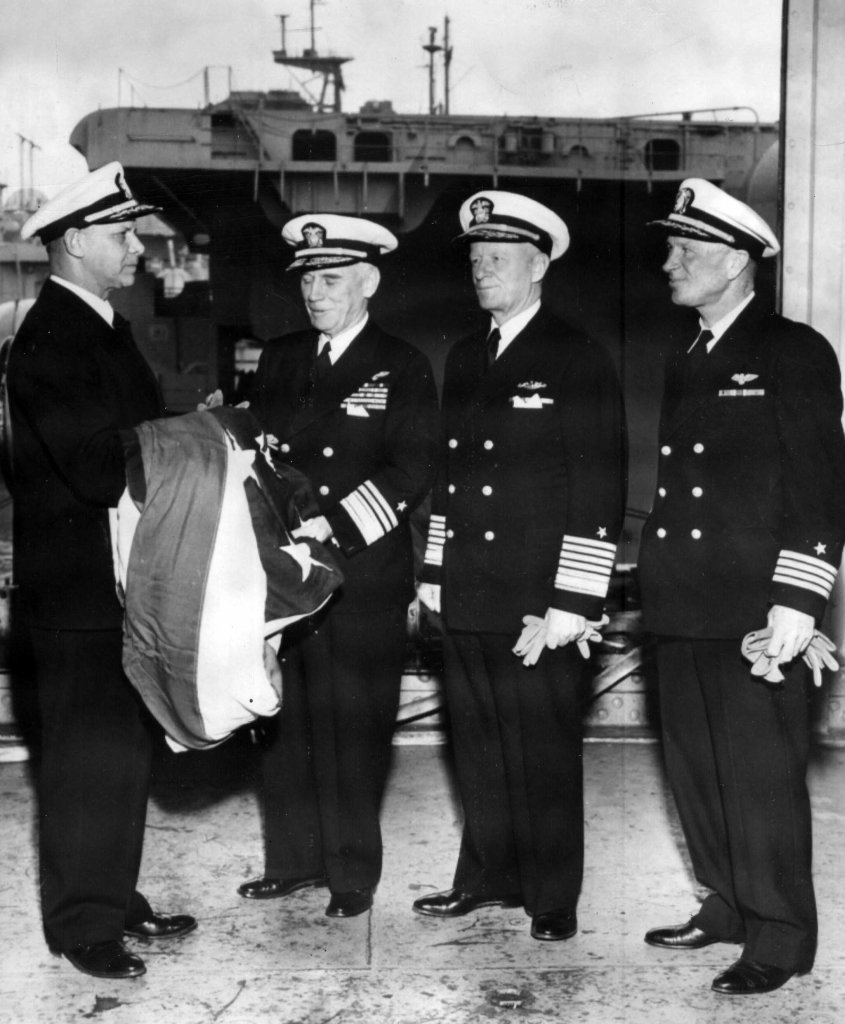 121k | USS Antietam (CV-36) was re-commissioned on January 17, 1951 at Alameda Naval Air Station. Left to right: CAPT George J. Dufek (CO Antietam) receives a flag from VADM George E. Murray (Commander, Western Sea Frontier), Fleet Admiral Chester W. Nimitz and CAPT J. P. Heath (Chief Staff Officer Western Sea Frontier). Courtesy of the Vallejo Naval and Historical Museum. |
