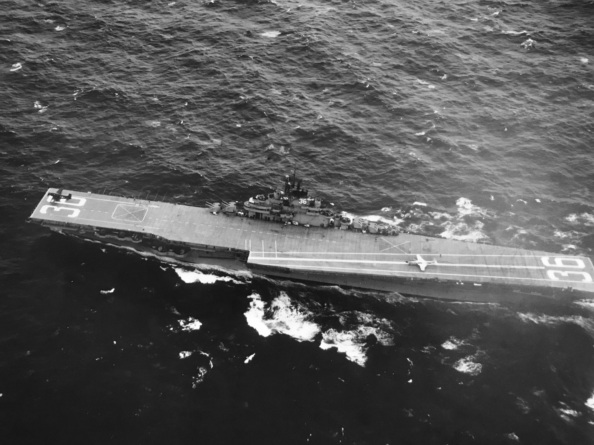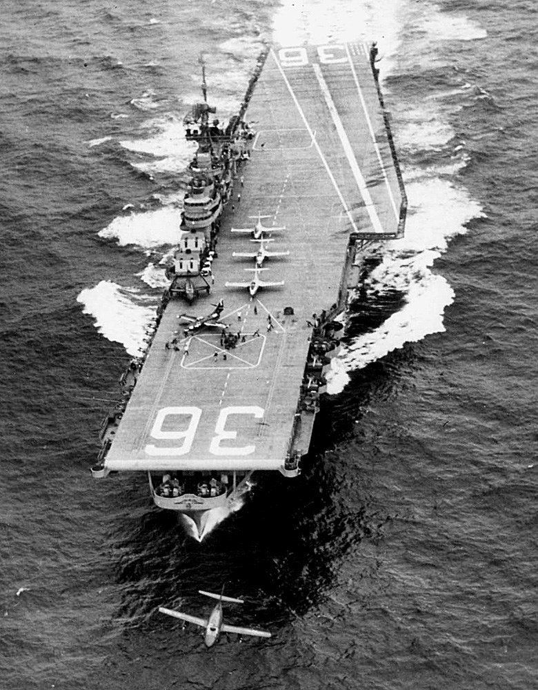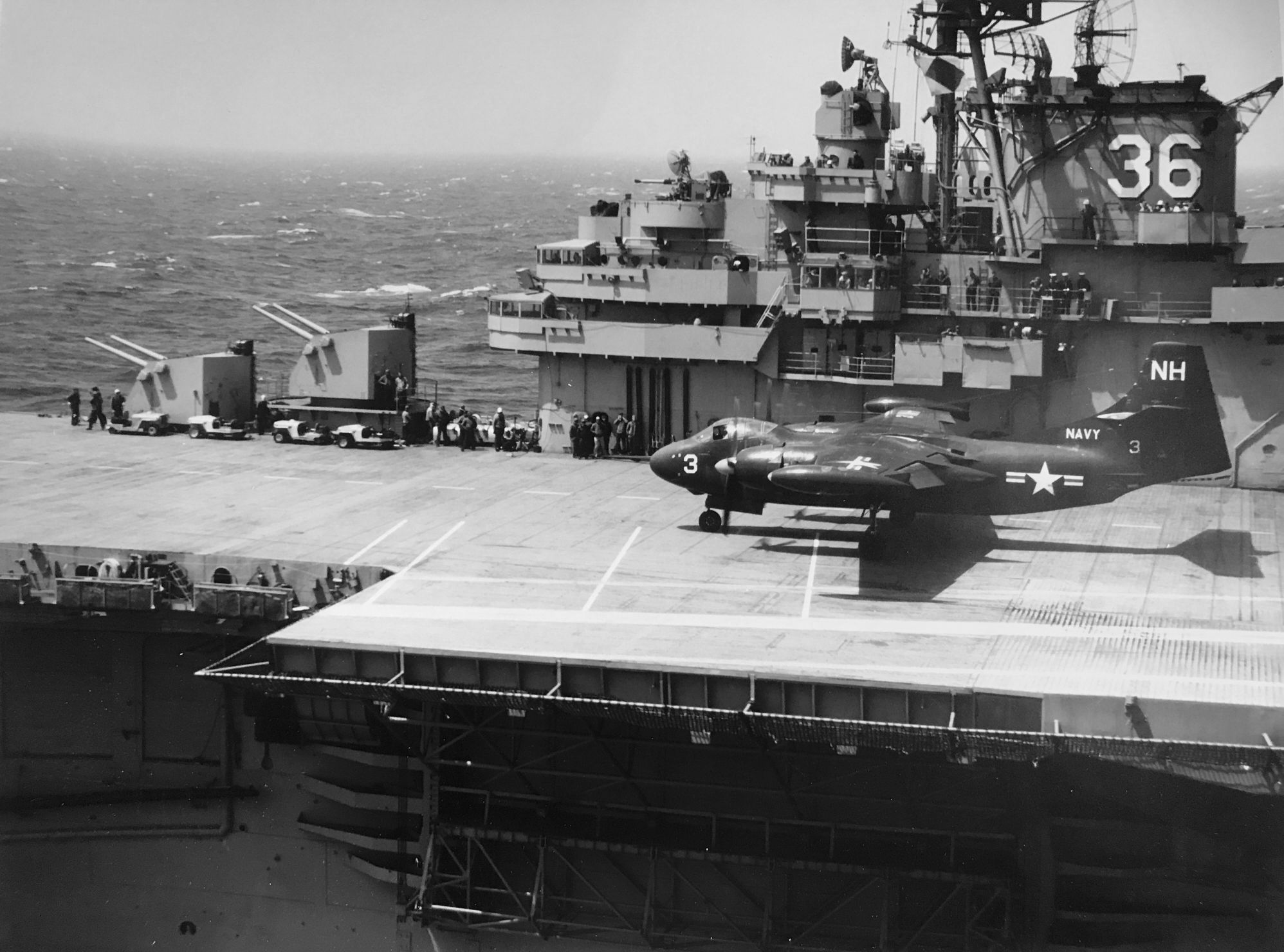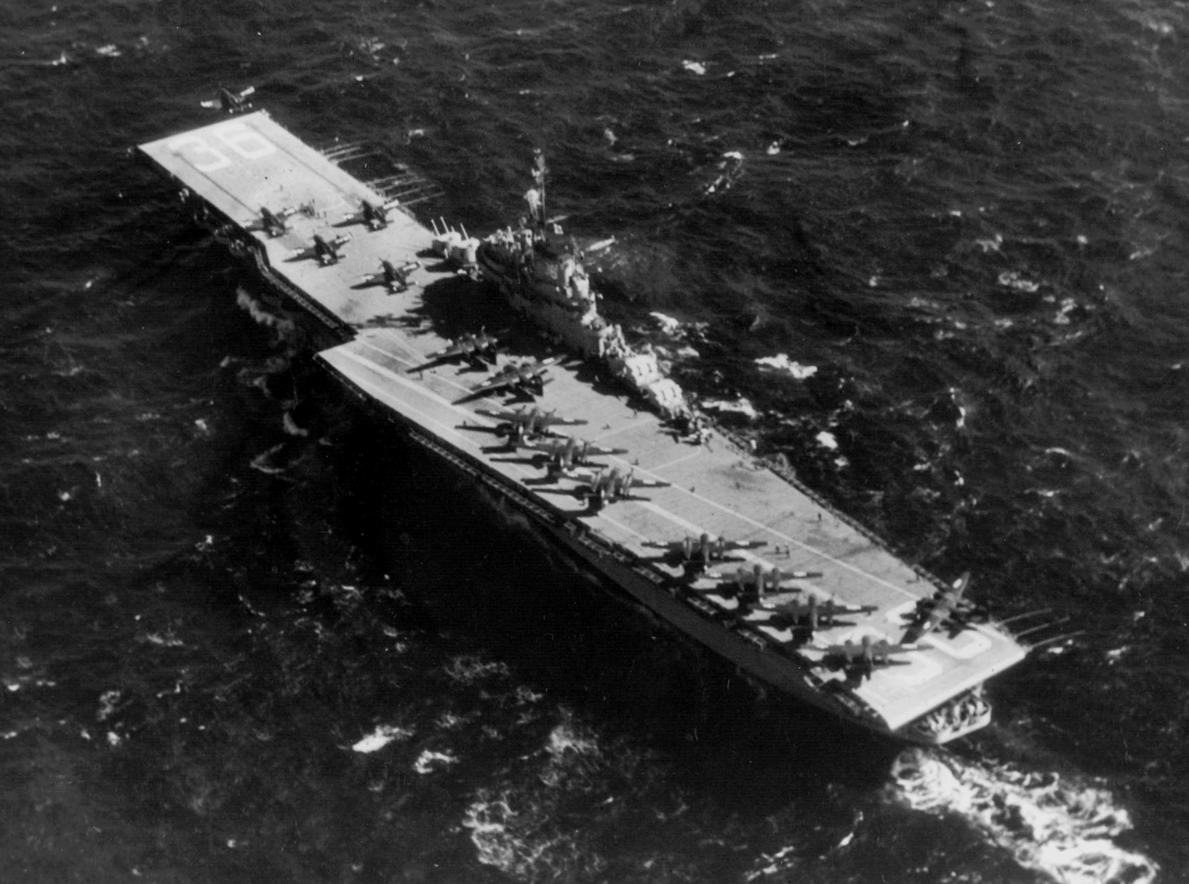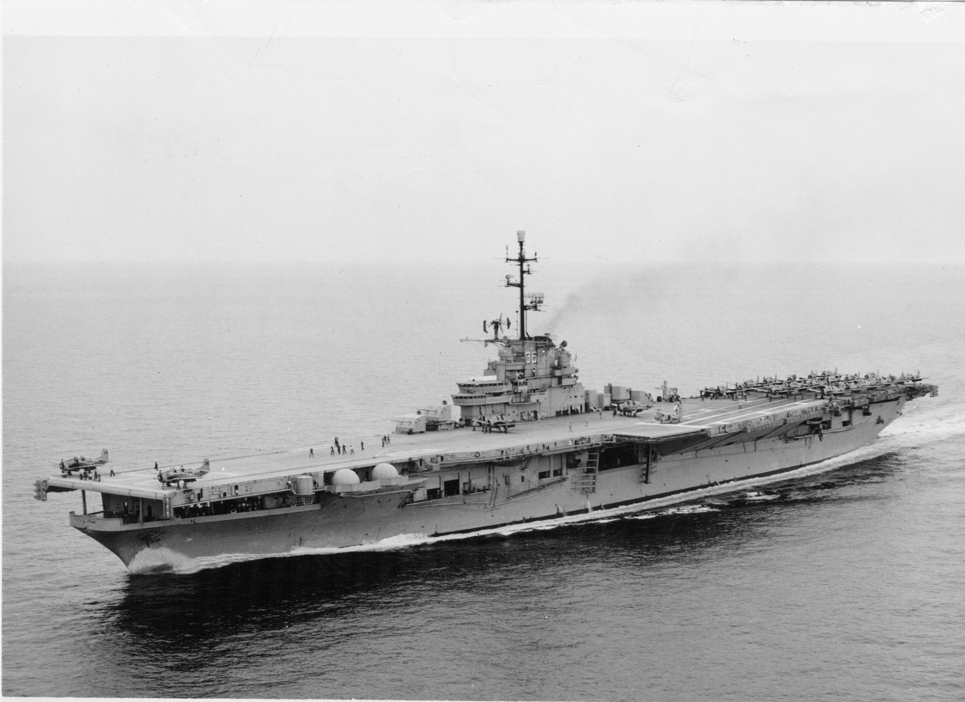 88k | USS Antietam (CV-36), Curtiss SB2C Helldiver aircraft on the carrier's flight deck, with officers and men on her island watching flight operations, circa 1946–47. The plane in the left foreground is an SB2C-5, Bureau # 83332. Official U.S. Navy Photograph, from the collections of the Naval History and Heritage Command, # NH 97366. |