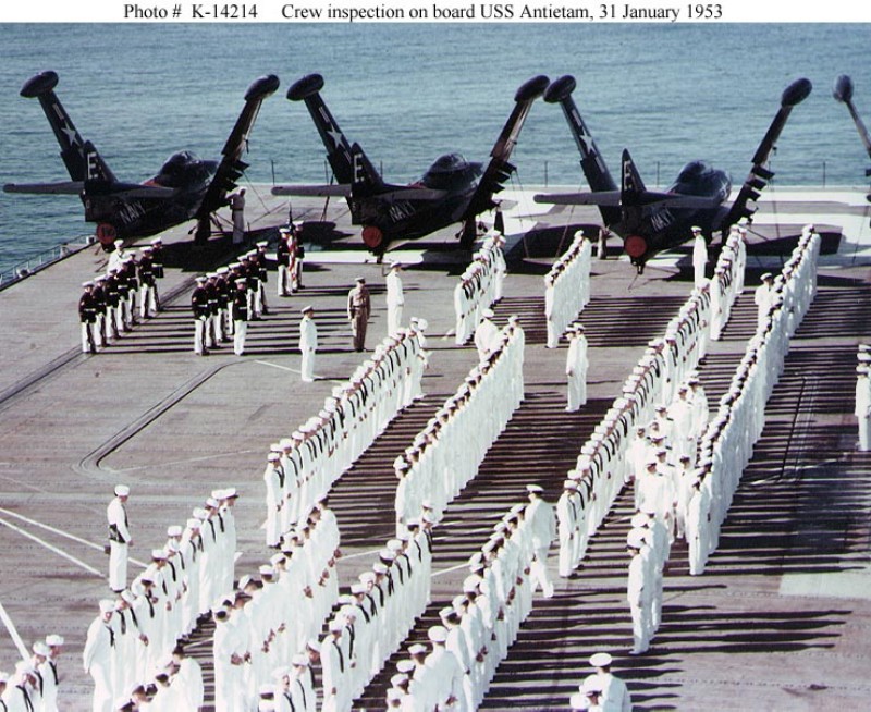 57k | USS Antietam (CV-36) at sea on 27 August 1951, shortly before deploying for Korean War duty. Crewmen are in formation on her flight deck, spelling out "The Flying =A= is on the way". Official U.S. Navy Photograph, now in the collections of the National Archives (photo # 80-G-448673). |