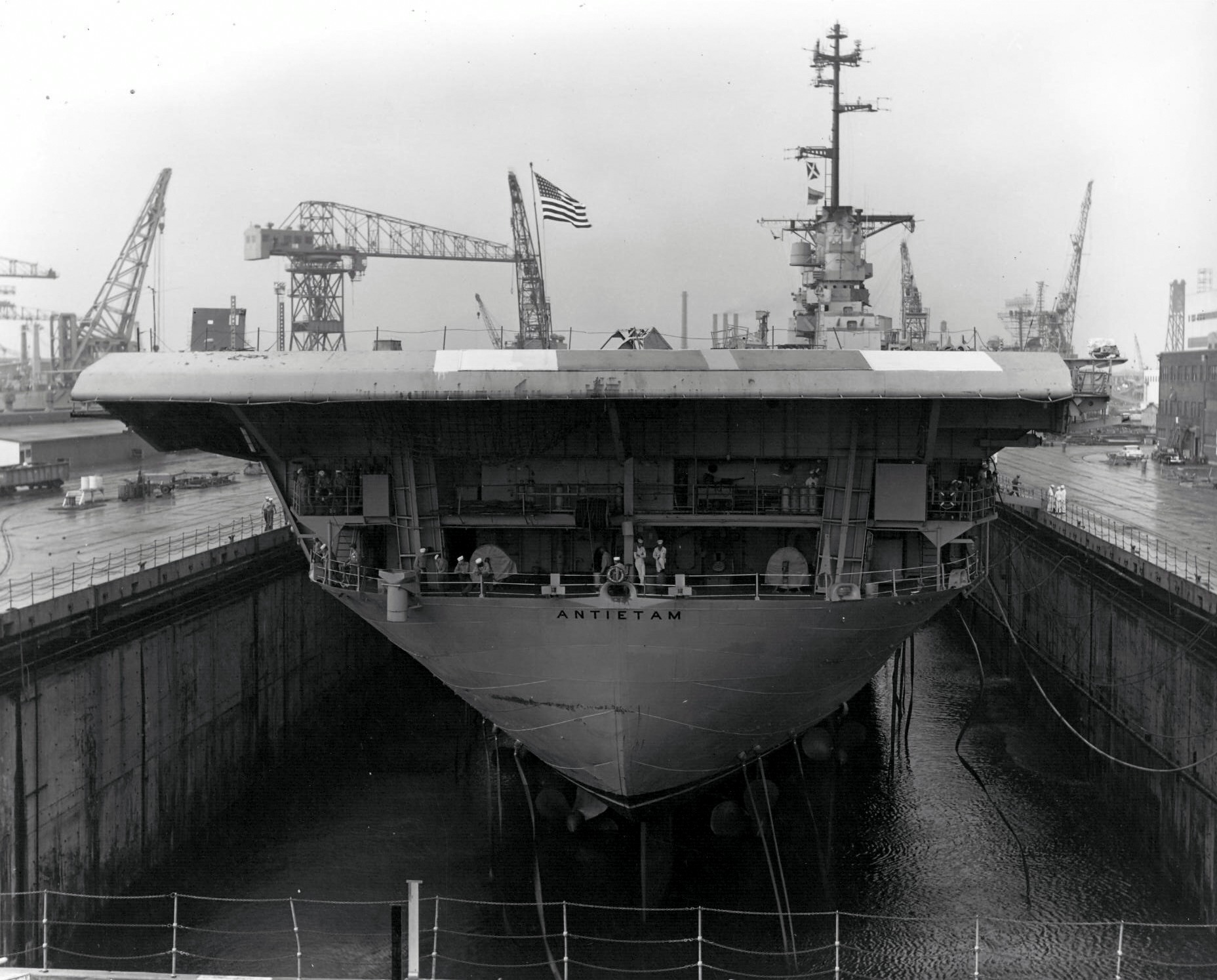 459k | Stern view of USS Antietam (CVS-36) in drydock at Norfolk, Virginia, on 29 July 1961. National Naval Aviation Museum, Robert L. Lawson Photograph Collection, # NNAM.1996.488.061.039. |