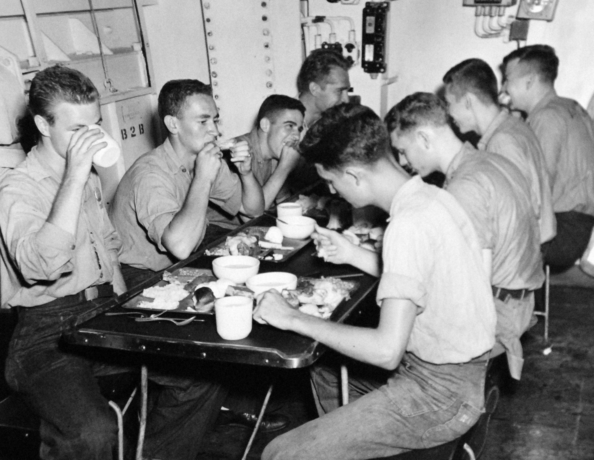 450k | Victory dinner aboard USS Antietam (CV-36) celebrating Japan's surrender, 22 August 1945. National Archives and Records Administration (NARA) photo, # 80-G-338366. |
