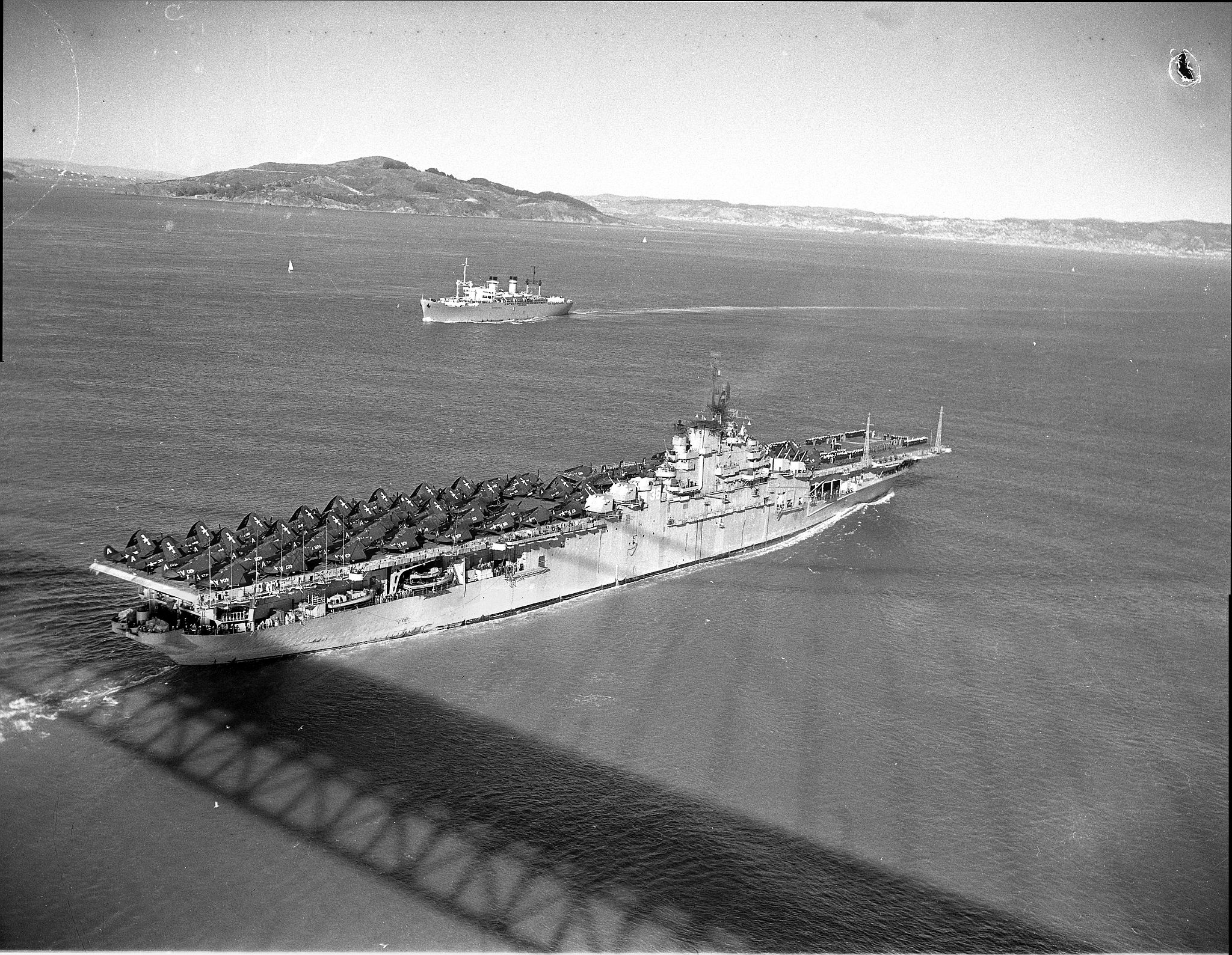 890k | USS Antietam (CV-36) just passed under the Golden Gate Bridge (Note shadow of the bridge's roadway). She is likely heading for Naval Air Station Alameda. Probably in October 1947. Courtesy of the Vallejo Naval and Historical Museum. |