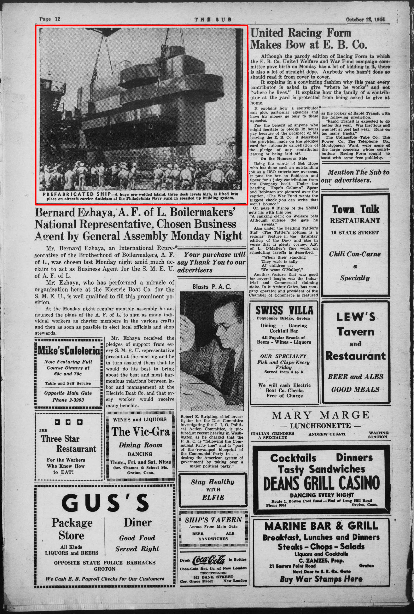 918k | "PREFABRICATED SHIP—A huge pre-welded island, three deck levels high, is lifted into place on aircraft carrier Antietam at the Philadelphia Navy yard in speeded up building system." The Sub, Groton, Connecticut, Thursday, 12 October 1944. |