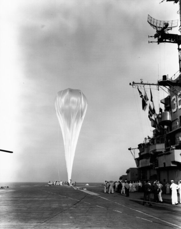 288k | A 411-foot plastic balloon, manned by Commander Malcolm D. Ross, USNR, and Lieutenant Commander Victor A. Prather, MC USN, is about to be released from USS Antietam (CVS-36) during project Strato-Lab, 27 April 1961. National Archives and Records Administration (NARA), photo # USN 1054266. |