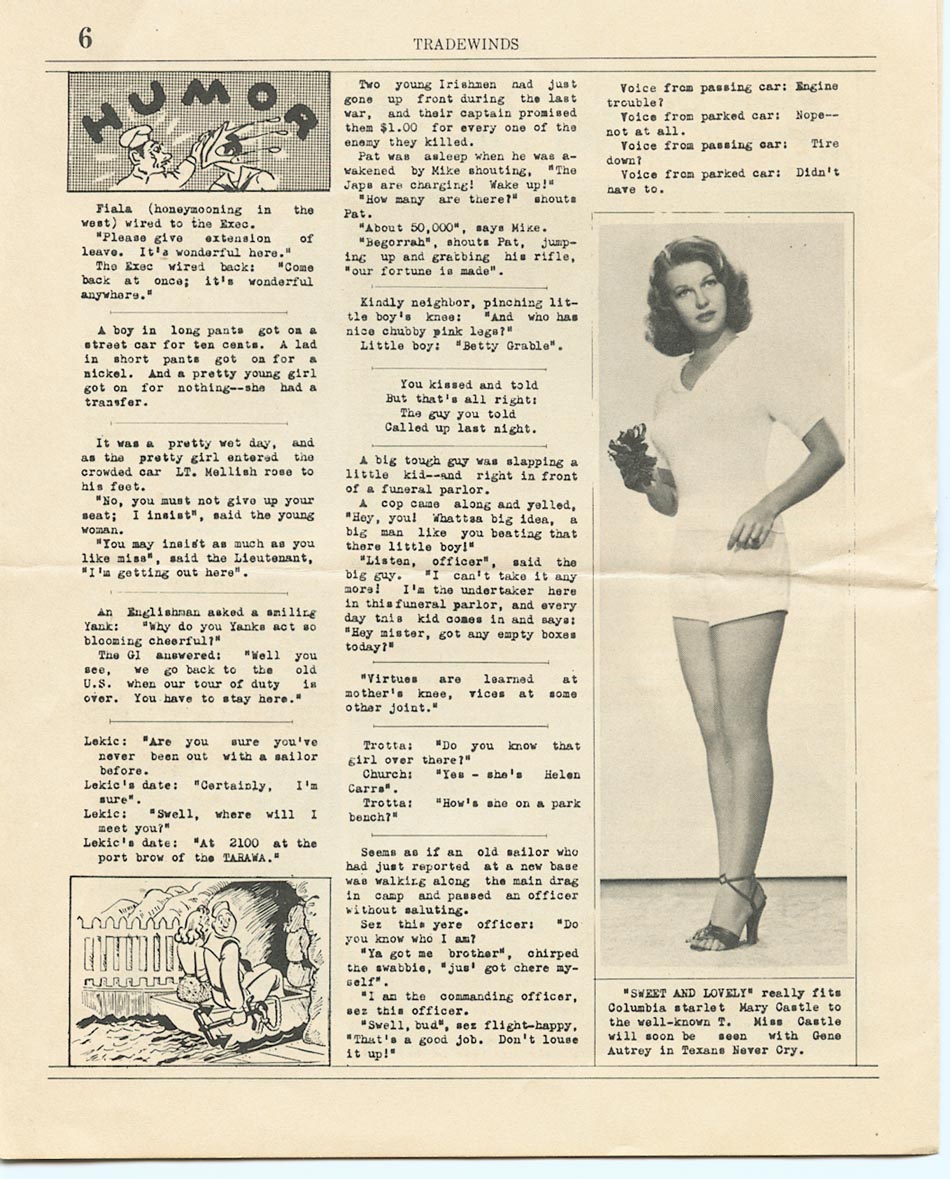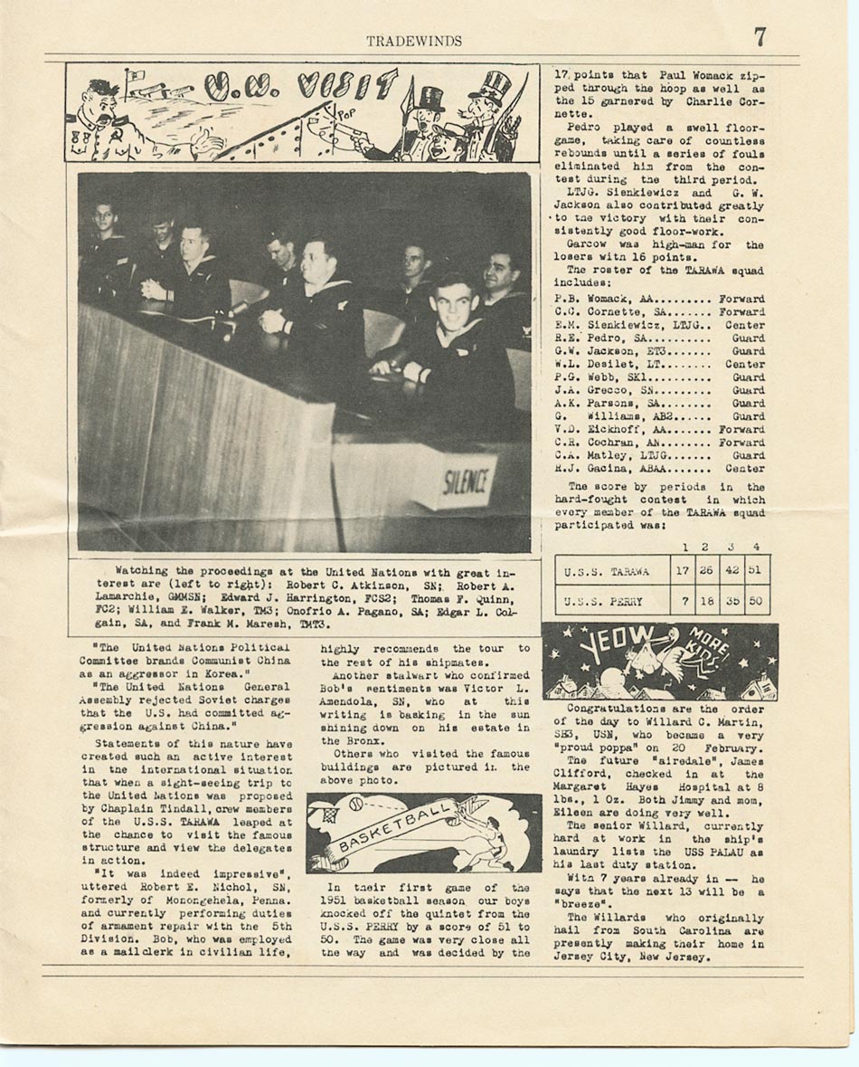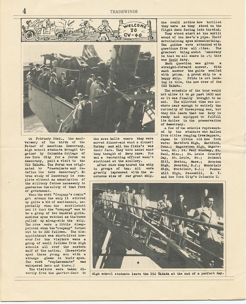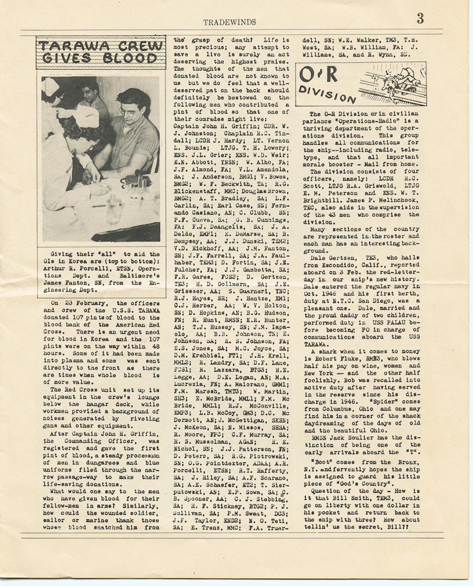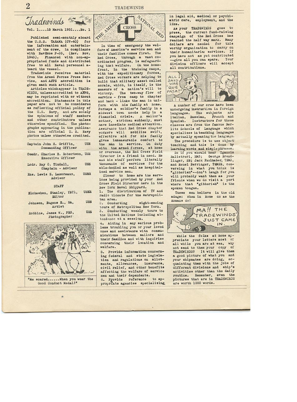 "Published semi-monthly aboard the U.S.S. Tarawa (CV-40) for the information and the entertainment of the crew"...