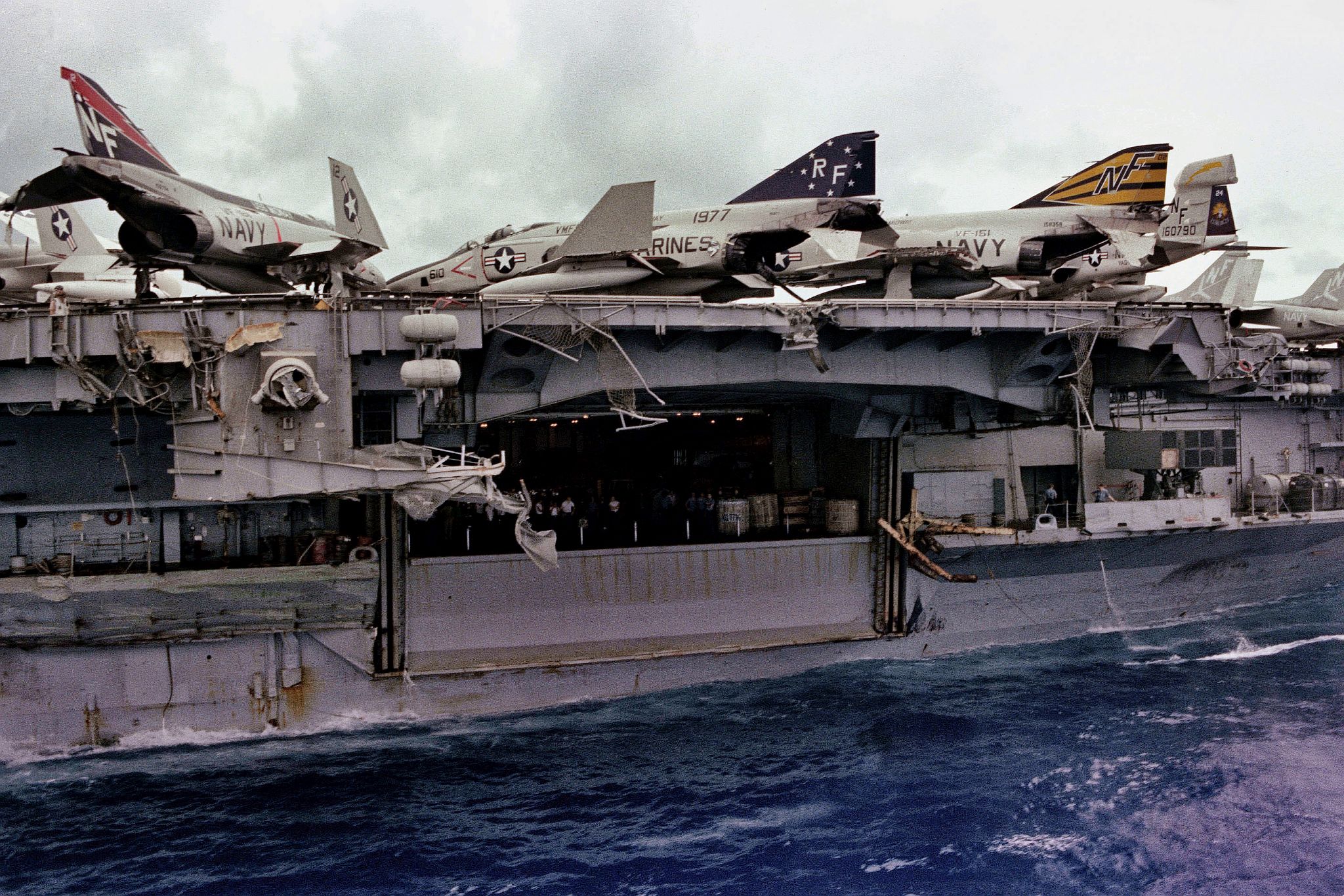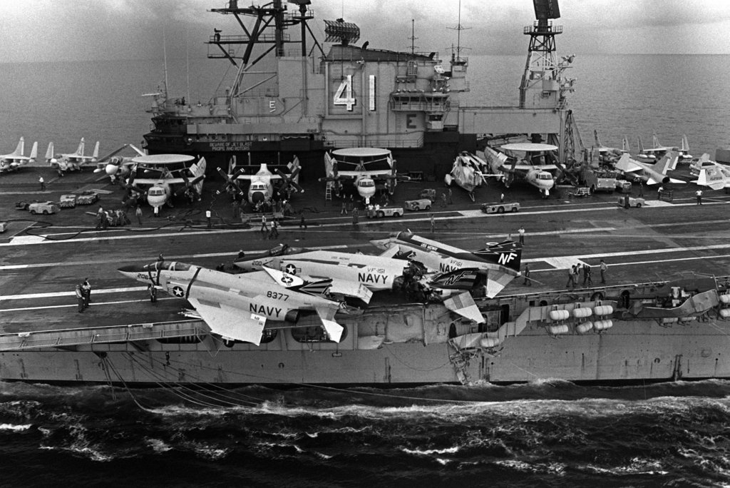 710k | A port amidships view of the aircraft carrier USS Midway (CV-41) showing the damage resulting from a collision with the Panamanian freighter Cactus. Defense Media Activity Center (DMA), # DN-SC-84-02491. |