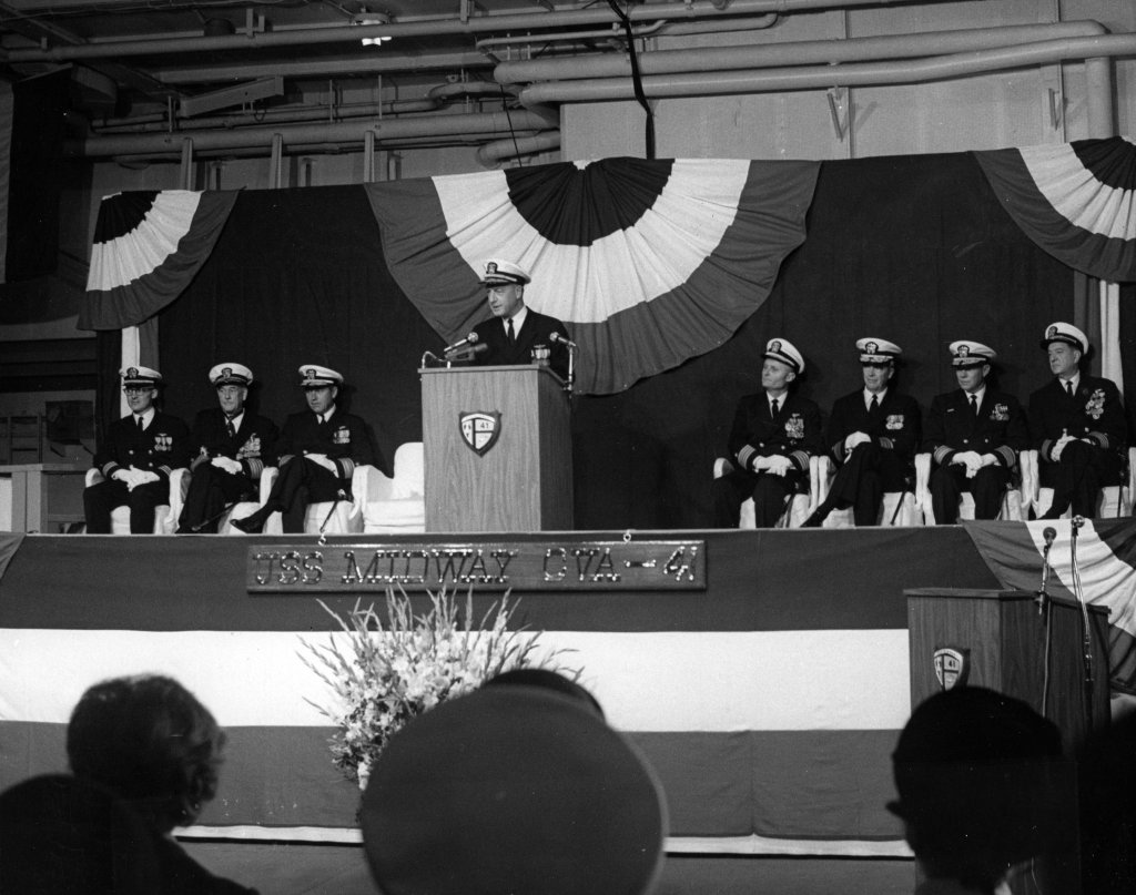 131k | VADM Allen M. Shinn, COMAIRPAC, speaking at the Re-Commissioning Ceremonies of USS Midway (CVA-41) at Hunters Point Naval Shipyard, 31 January 1970. |
