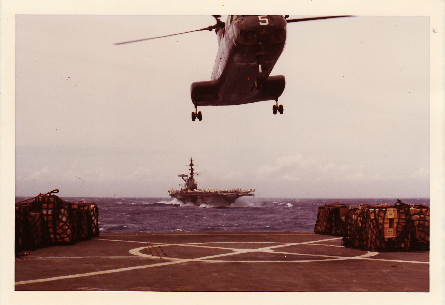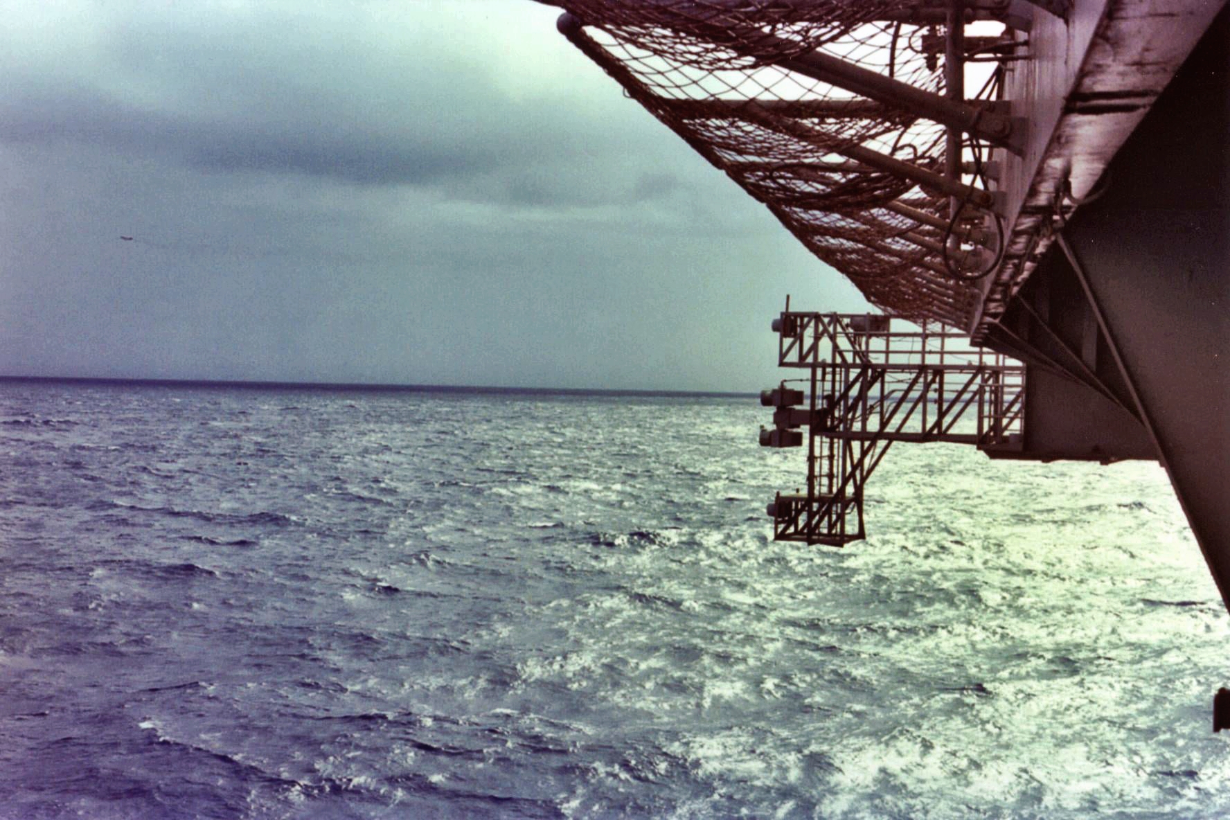 365k | USS Midway (CVA-41), VERTREP with USS San Jose (AFS-7), South China Sea, October 1971. This was Midway's first deployment (16 April–6 November 1971) after modernization. Carrier Air Wing (CVW) 5 was aboard. |