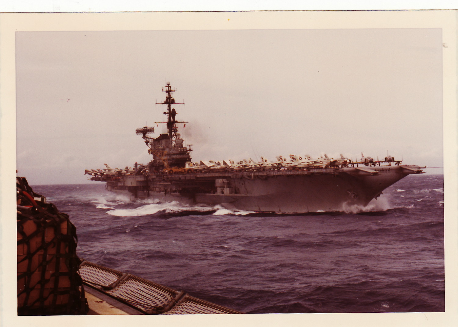 96k | Photo taken on 13 April 1983, during exercise FleetEx 83-1, in the North Pacific Ocean. The three carriers are, clockwise from left, USS Enterprise (CVN-65), USS Midway (CV-41), and USS Coral Sea (CV-43). Then LT Jim Petroski was aboard the Big E in the Reactor Dept., as RC division officer, and comments: "I spent some time up on the signal bridge during this photo op and got some great pictures of aircraft flying over us. Our air wing was the only one which could fly that day as the sea was quite rough—wave splashes were coming over the hurricane bow—and neither the Coral Sea nor Midway could launch/recover a/c. The frigate to starboard of "E" went up to 1/2 under in the waves, and the Coast Guard cutter to port came about 2/3 out of water. Quite a sight that day." "The April 13 date sounds correct. We were crossing and re-crossing the international date line a lot at that time. So some days were 46 hours long, and others were 2 hours long. It was easy to forget what day it was!" |
