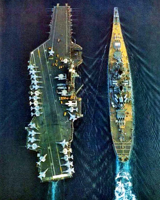247k | USS Midway (CV-41) conducting an underway replenishment with battleship USS Iowa (BB-61), December 1987. Midway and Iowa were in the Persian Gulf as part of Battle Group Alpha. US Navy photo by PH2 Raszler. Defense Media ActivityDMA (DMA), photo # DN-SC-92-05313. |
