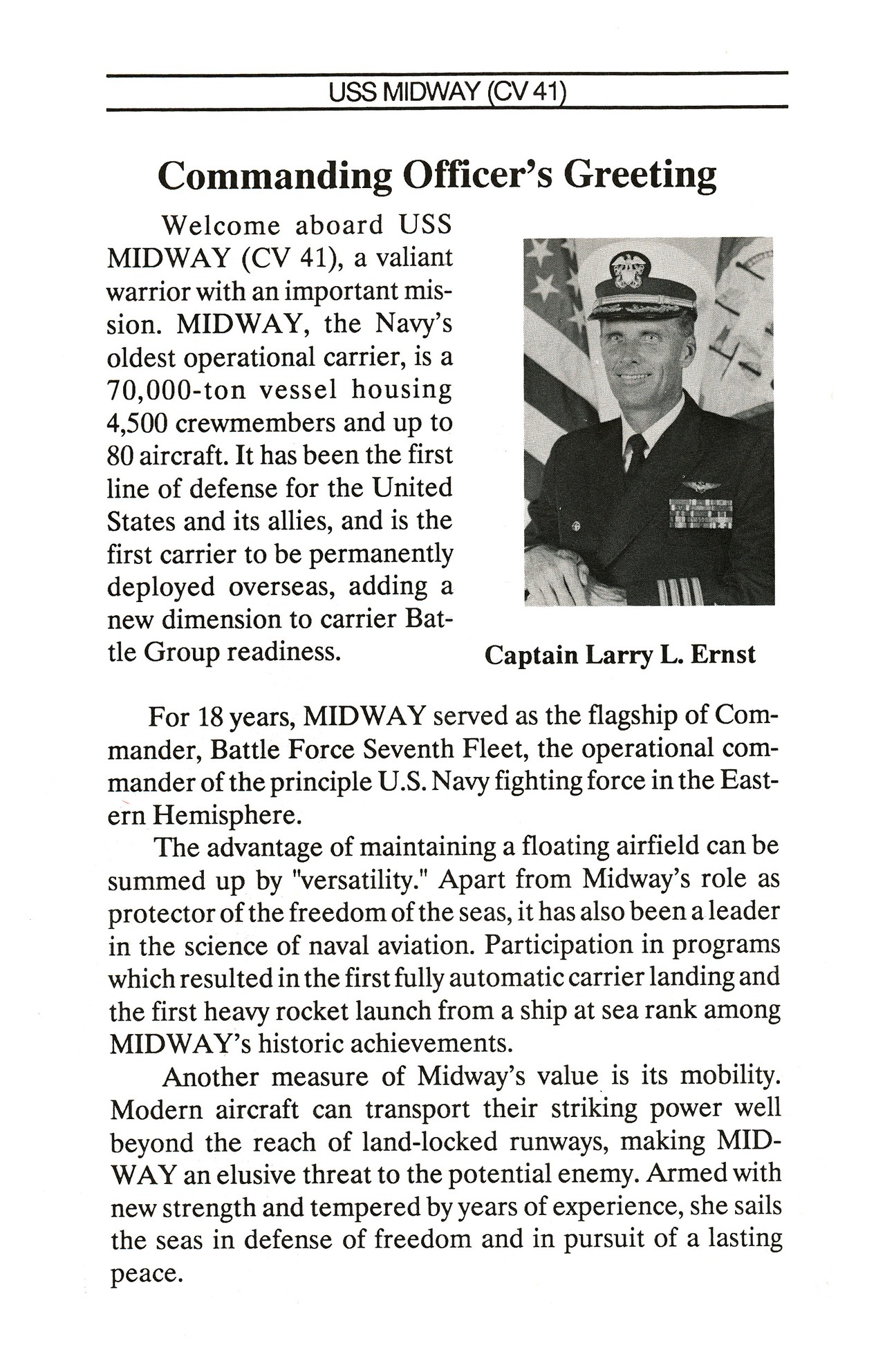 560k | USS Midway (CV-41), Commanding Officer's Greeting, Captain Larry L. Ernst, 1991–1992. |