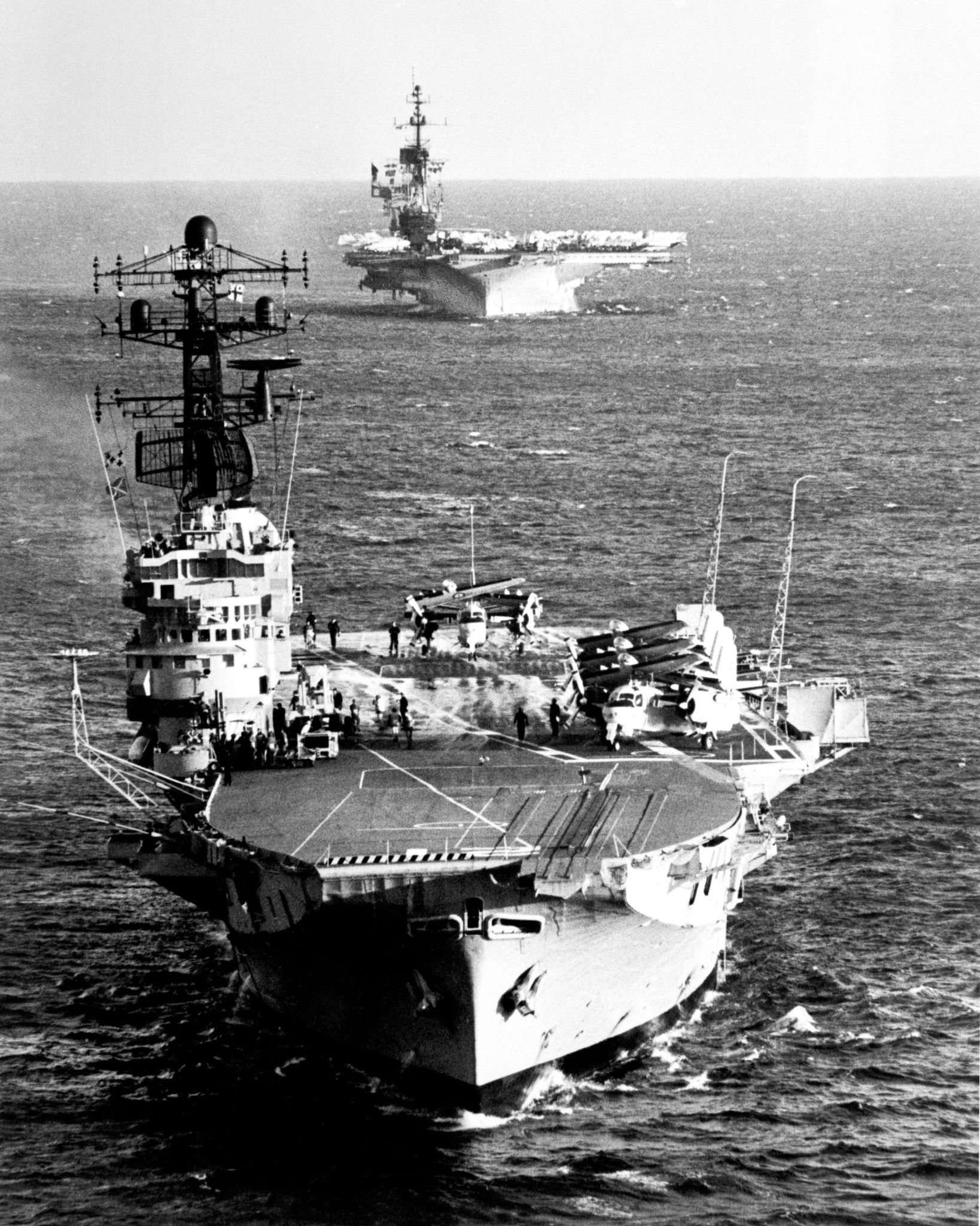626k | An aerial bow view of the aircraft carrier HMAS Melbourne (R21) foreground, and the aircraft carrier USS Midway (CV-41) underway, 16 May 1981. Midway was on a deployment to the Western Pacific and the Indian Ocean from 23 February to 5 June 1981. Photographer unknown. Defense Media Activity, VIRIN: DN-SN-84-02496. |