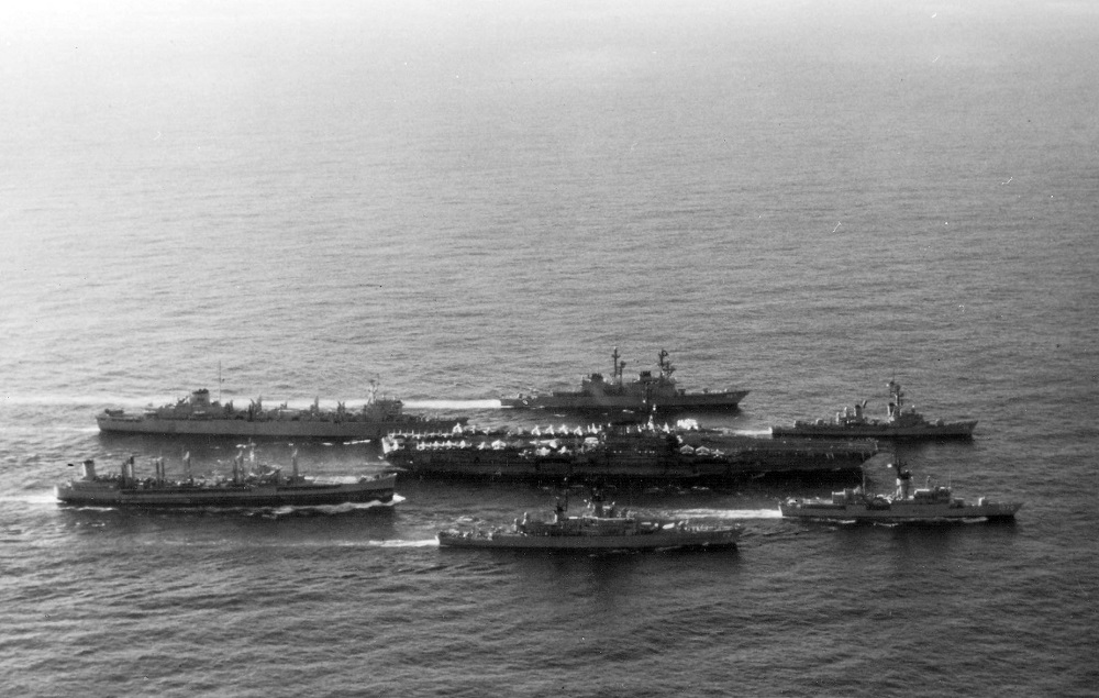 2.37M | Crew members pose for a photo on the bow of USS Midway (CV-41), 16 December 1987, in the Arabian Sea. The photo was taken during the carrier's deployment to the Western Pacific and the Indian Ocean, 15 October 1987–12 April 1988. Various aircraft of Carrier Air Wing (CVW) 5 are visible on deck. Ships in the battle group pictured are, left to right: the ammunition ship USNS Kilauea (T-AE 26), Midway, the combat stores ship USS White Plains (AFS‑4), the fleet oiler USNS Mispillion (T-AO 105), and the frigate USS Knox (FF-1052). Photo by PH3 William Holck, USN. US Defense Imagery photo VIRIN: DN-ST-88-02563 |