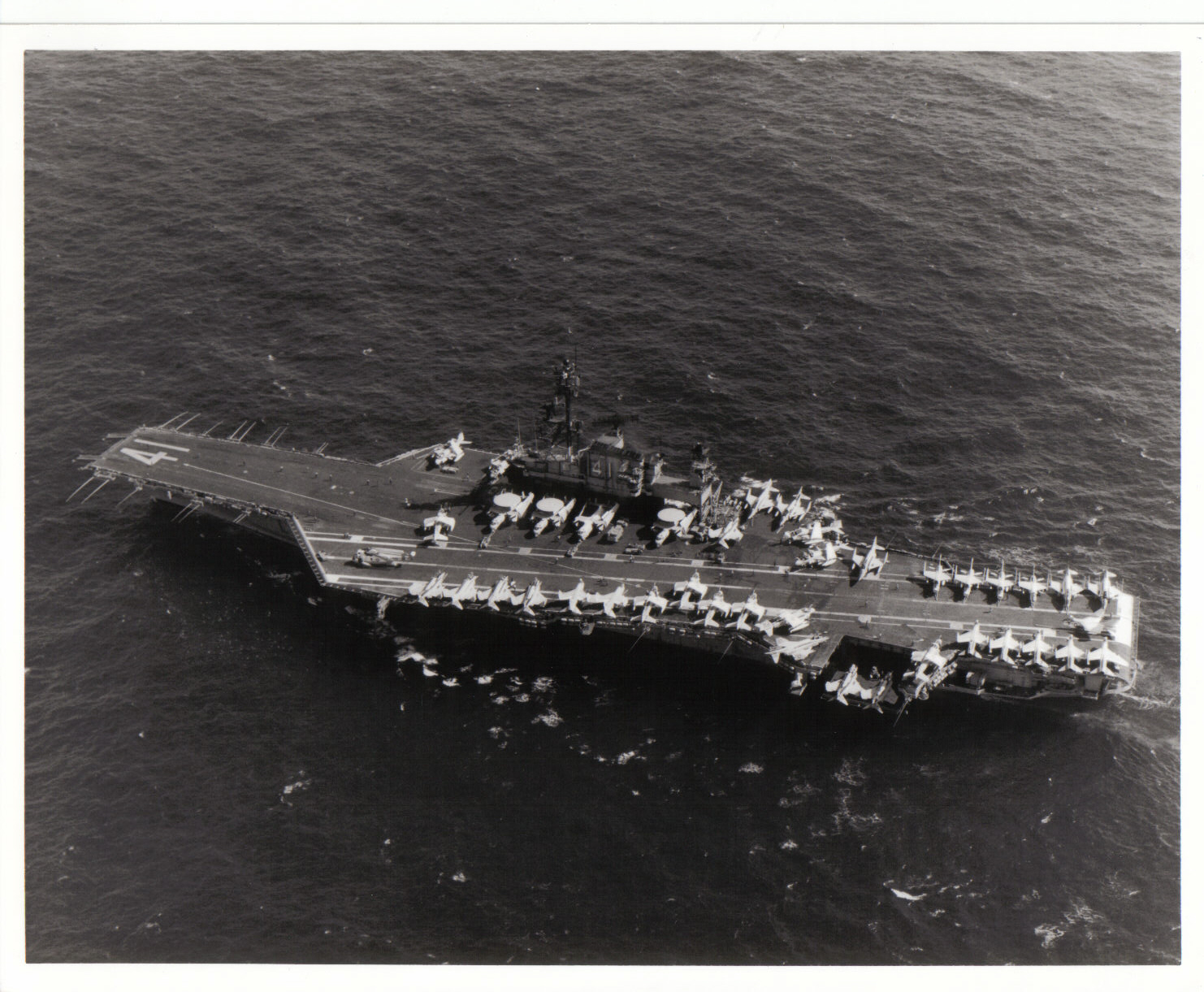 139k | At sea in the Western Pacific, 30 November 1974. Good overhead showing stern of Midway after her 1966-1970 overhaul: note 3 deck-edge elevators, two to starboard (forward and abaft the island) and one to port. F-4s, A-6s, A-7s, E-2s and an SH-3 are shown on the flight deck. | USN | |