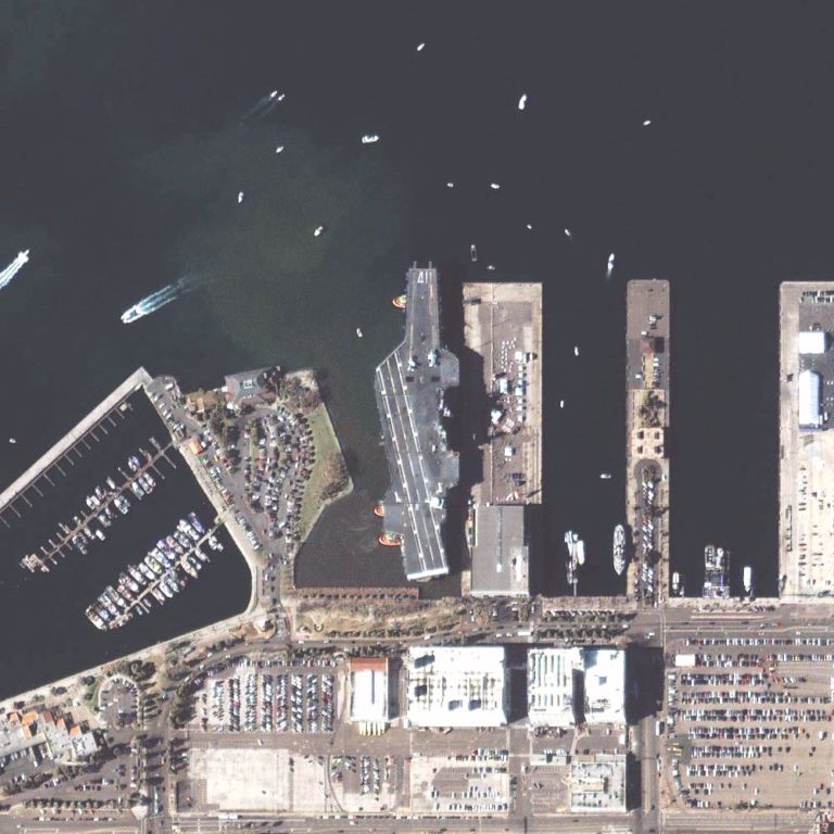 91k | This is a satellite image of the ex-USS Midway as the tugs nudged her alongside Navy Pier, San Diego, CA, at 11:38 a.m. on January 10, 2004. |