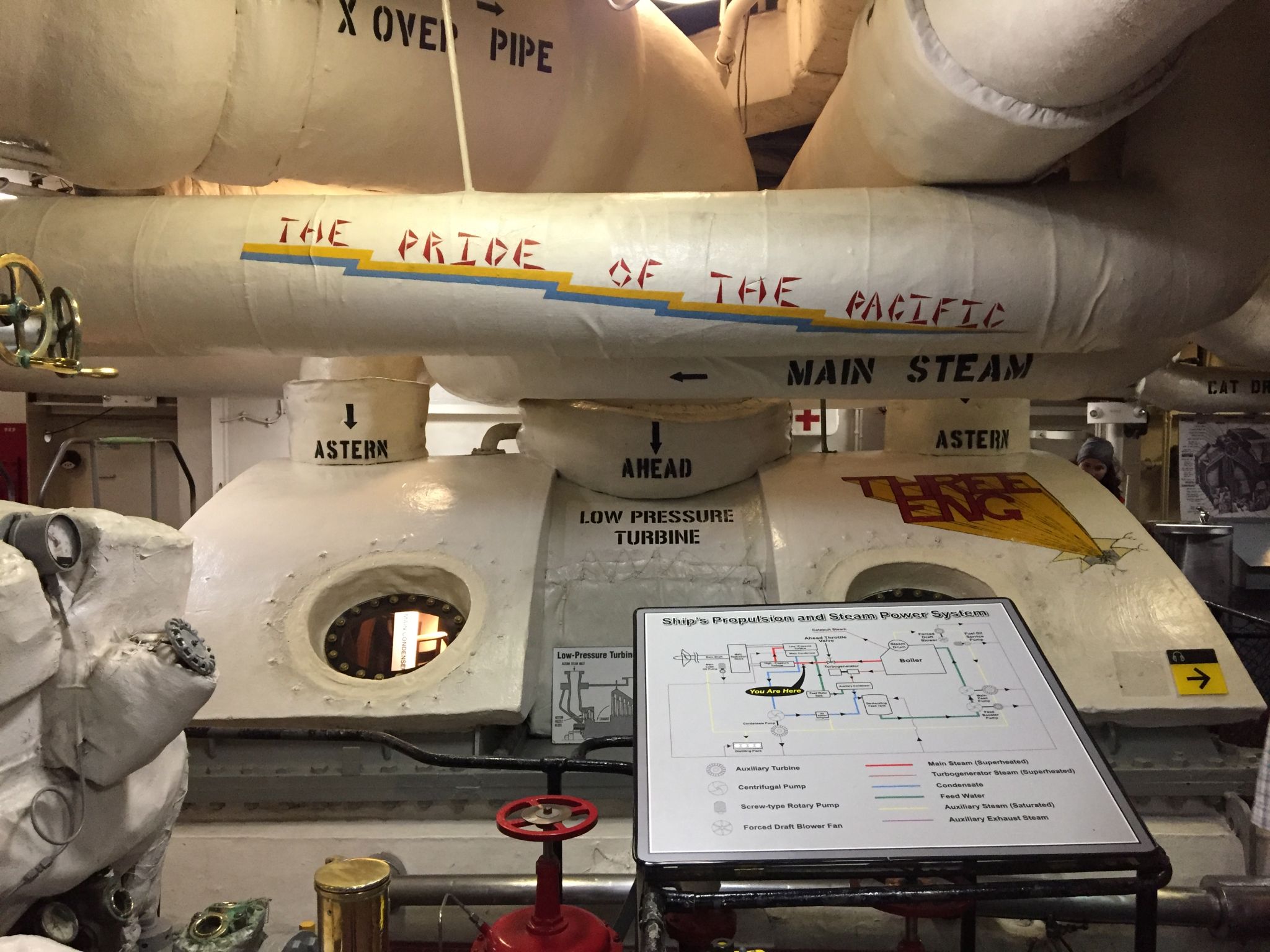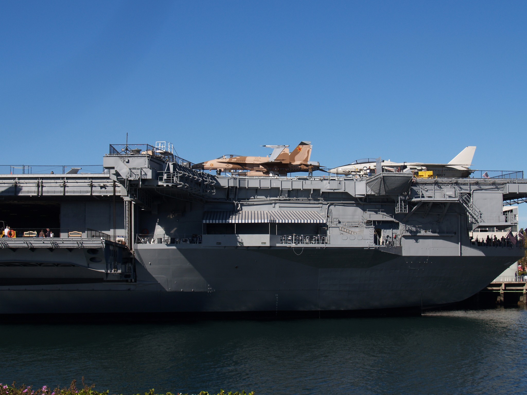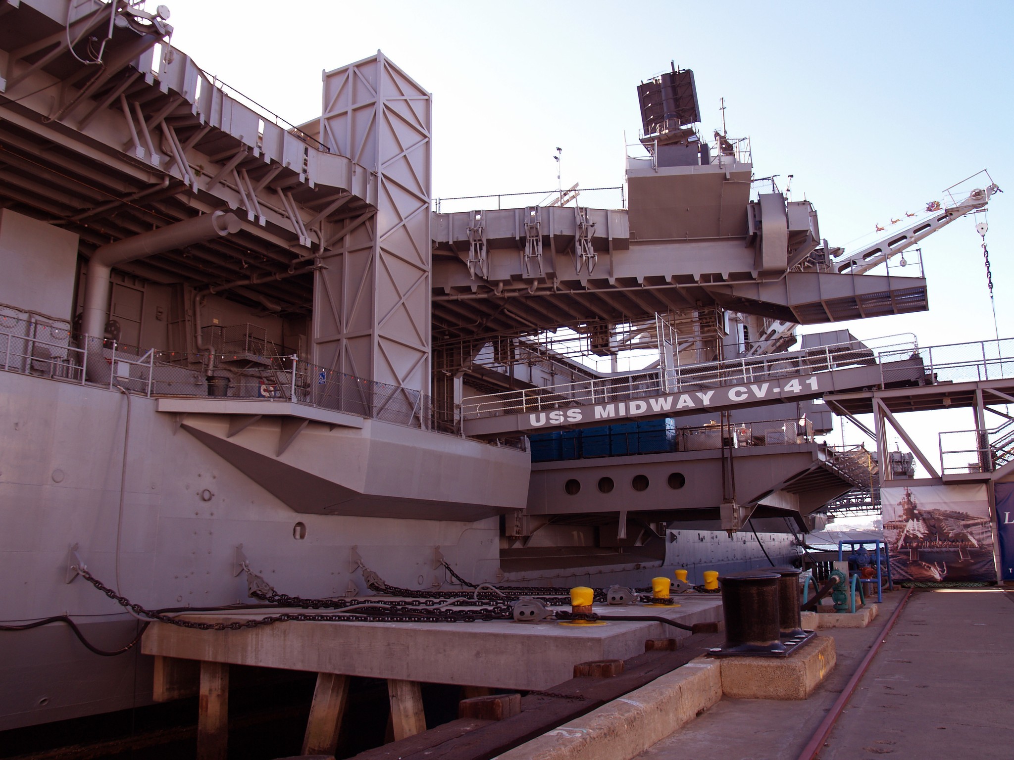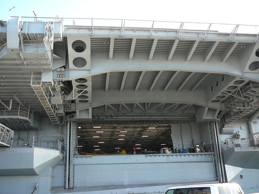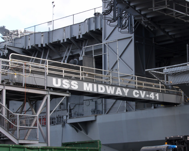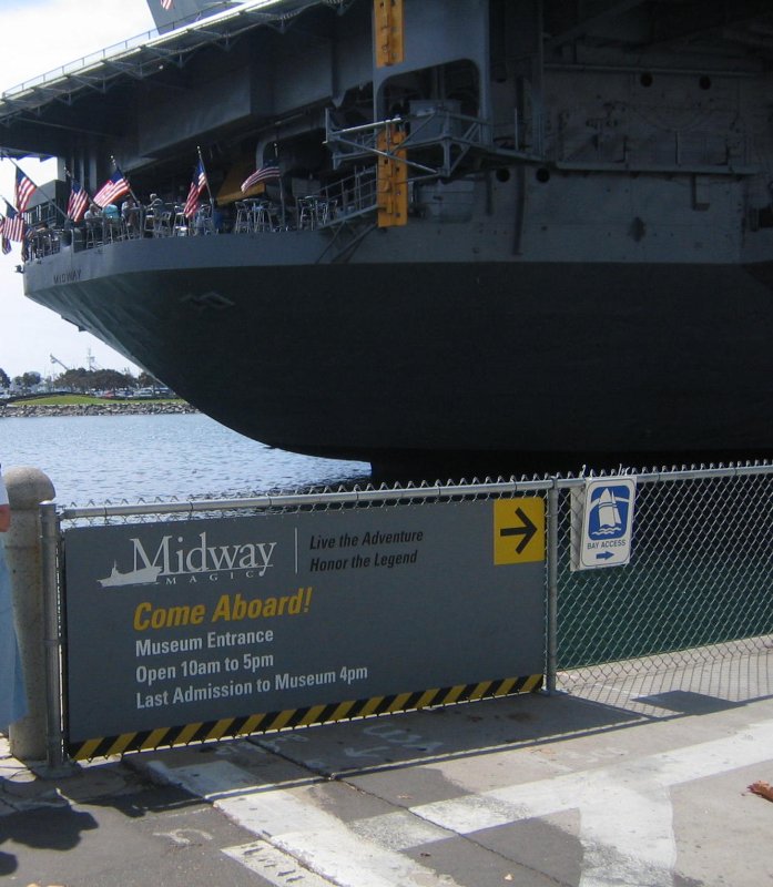 100k | USS Midway Museum Entrance. Note ports in ship's transom, through which anti-torpedo decoys (towed noisemakers) were trailed. |