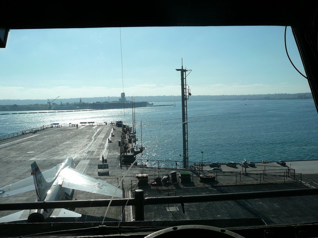 109k | A great panorama shot taken from the bridge of the Midway. This is a beautiful picture of downtown San Diego all the way to the Coronado Bridge which takes you over to North Island; November 29, 2005. Planes seen on deck are: Foreground: Middle distance, left to right: Background, left to right: |