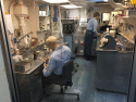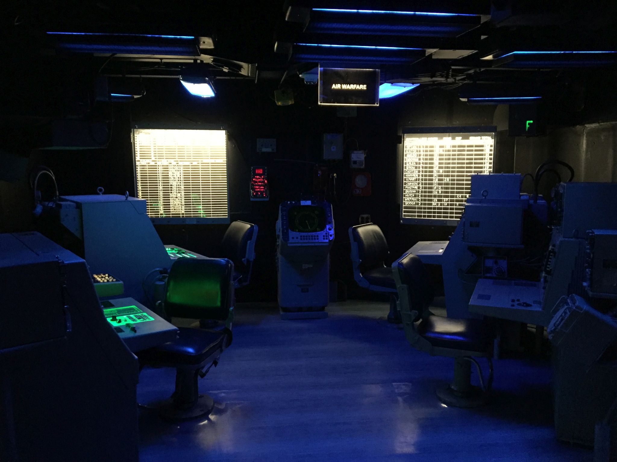 85k | "Pri-fly," looking forward. Primary Flight Control ("Pri-Fly") is the control tower for the flight operations on the carrier. Here, the "Air Boss" controls the takeoffs, landings, aircraft in the air near the ship, and the movement of planes on the flight deck. September 2005. |