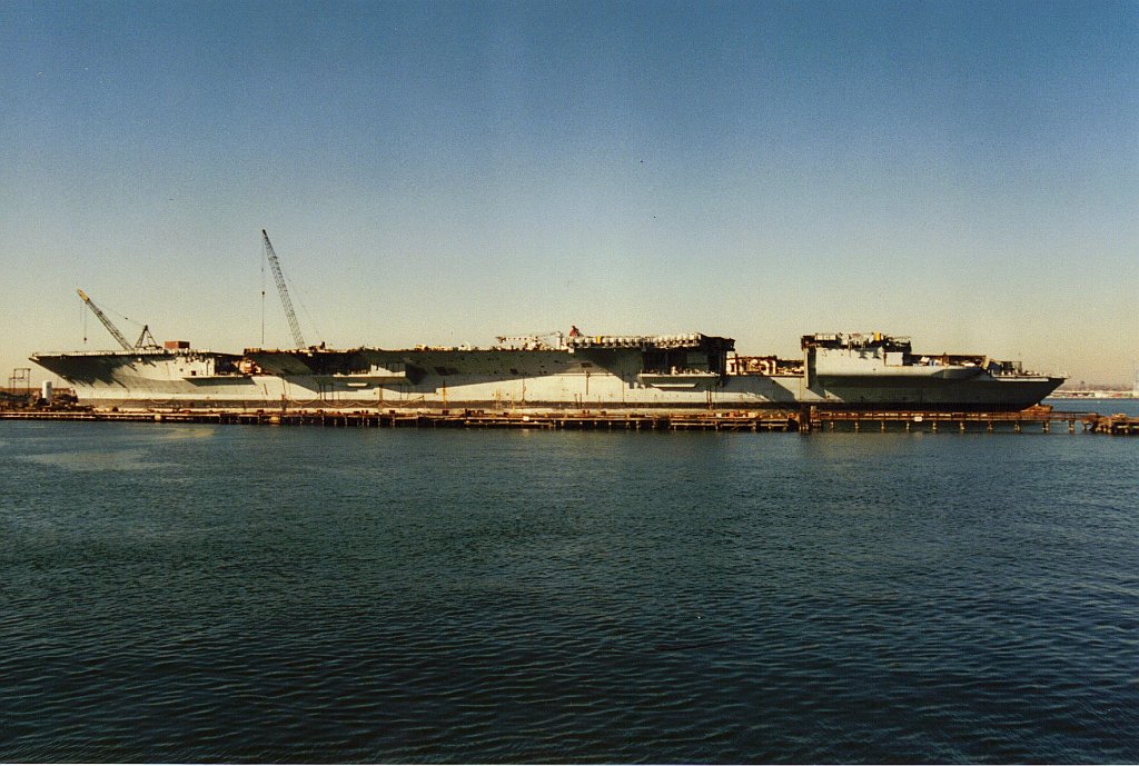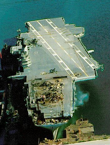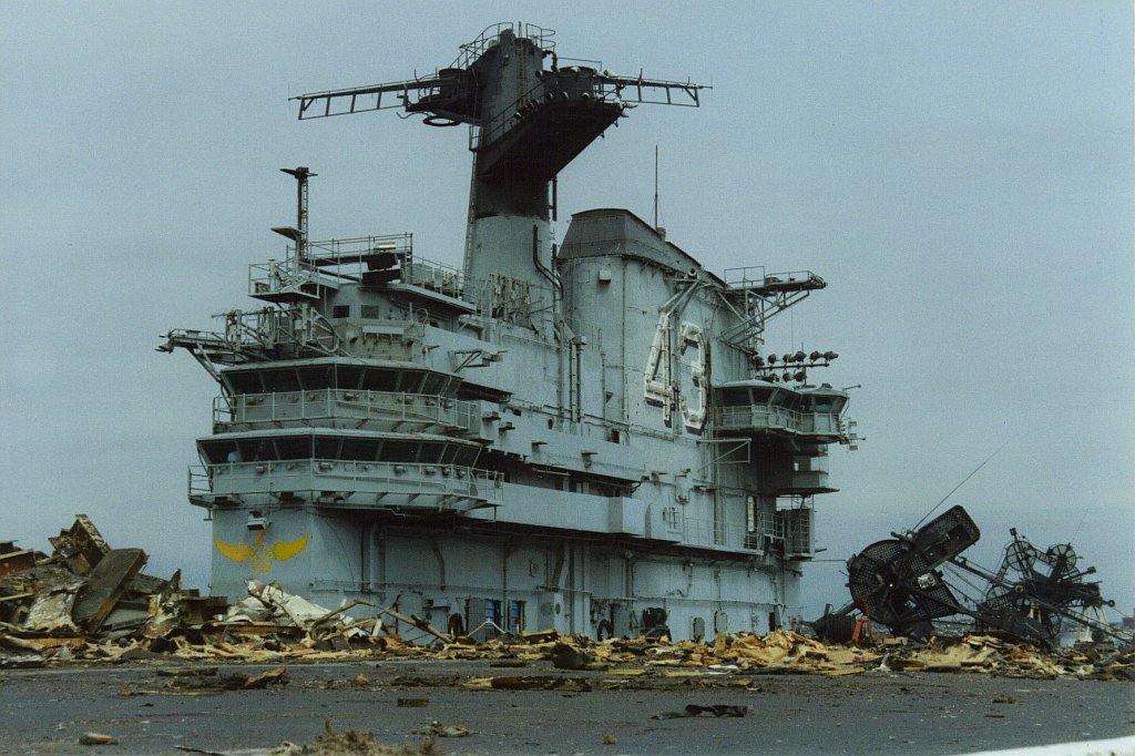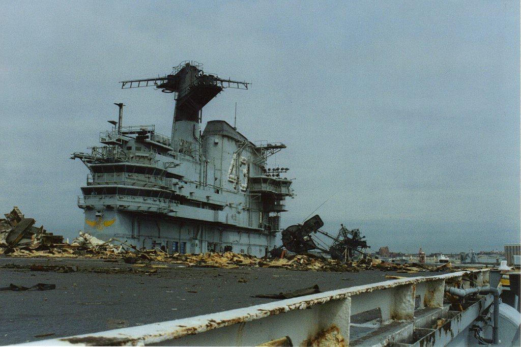153k | September 20, 1993 — The structure outboard of the hull on the starboard side forward had been cut off; the very forward end of the flight deck had been removed; and a hole had been cut in the flight deck just aft of the catapult accumulators. Debris from this cut was strewn around the flight deck between the catapults and the island. |