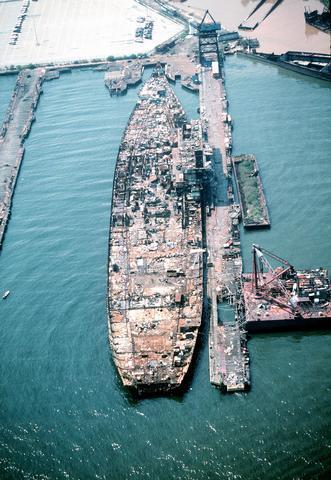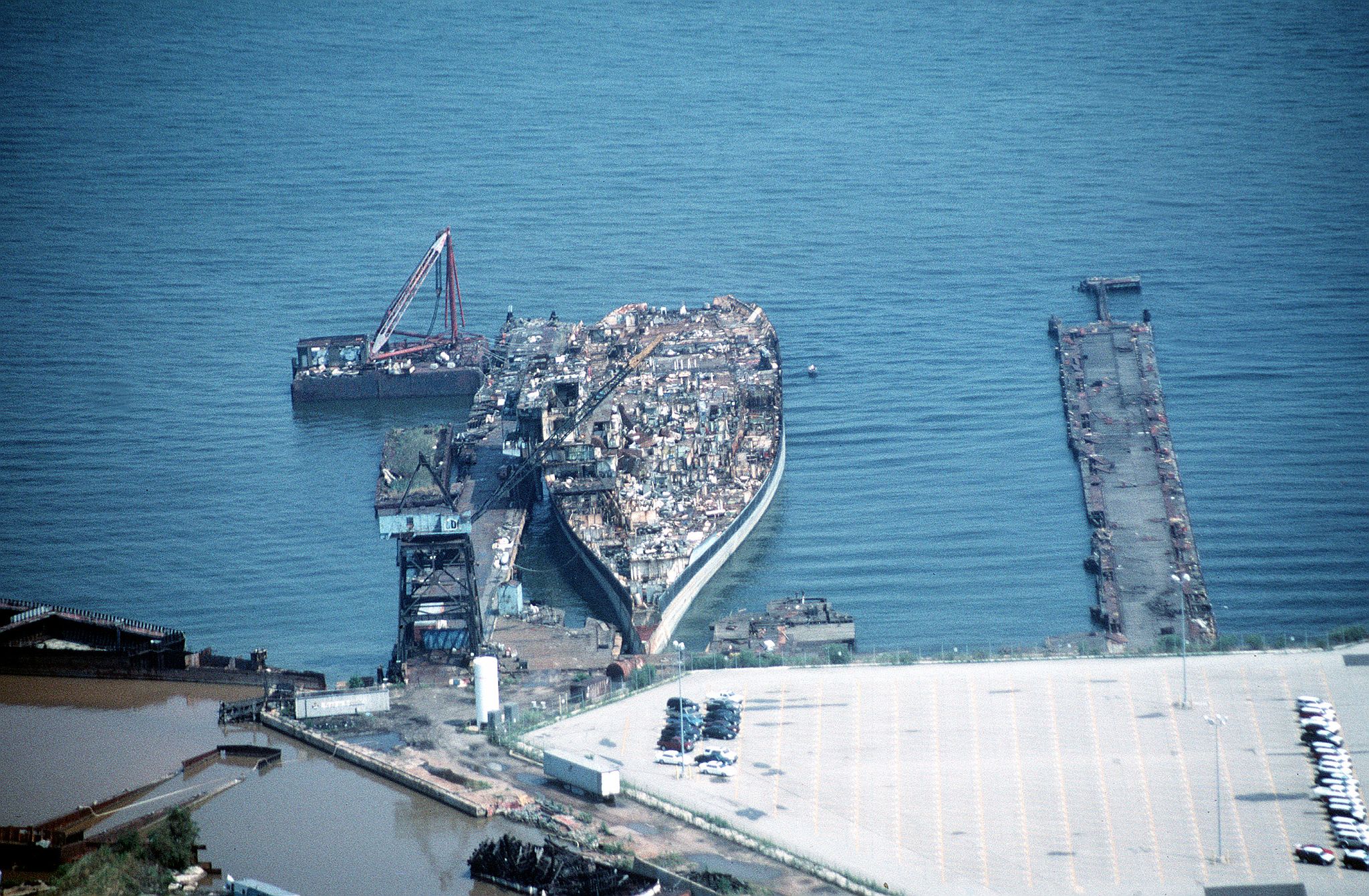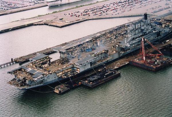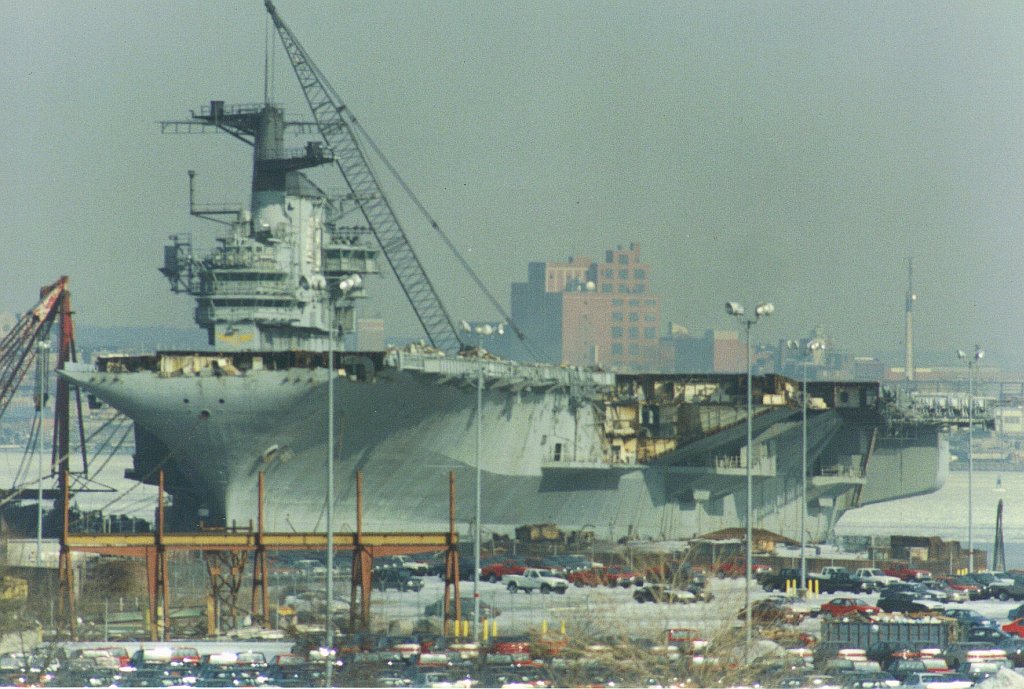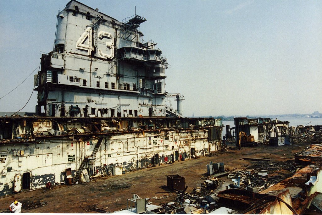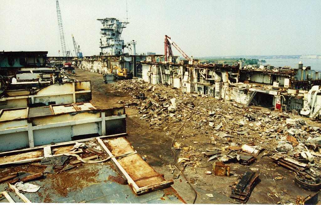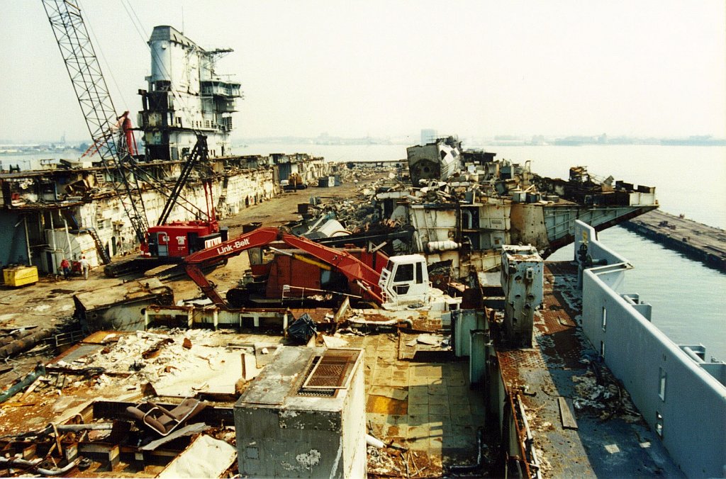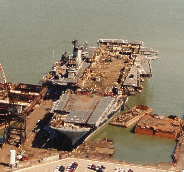 151k | December 2, 1994 — The entire island and stack structures were gone; the flight deck aft of the forward hangar bulkhead had been removed, along with most of the hangar walls. Scrap operations had not proceeded below the hangar deck level. |