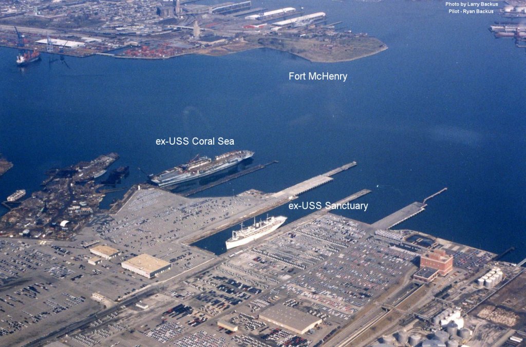 739k | Dated 1 September 1997, this is an aerial bow view of the former aircraft carrier Coral Sea (CV-43) in the late stages of being scrapped at the Lambert Point facility of the new Patapsco Marine Salvage Company. National Archives and Records Administration (NARA) photo, NARA Identifier: 6502725. DPLA identifier: 3f285906871733dc05fbfd9dcb3ee636. Photo by Don Montgomery, USN (Ret.) Submitted by Robert Hurst. |