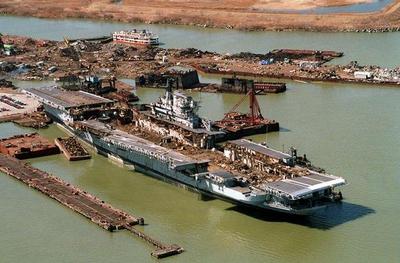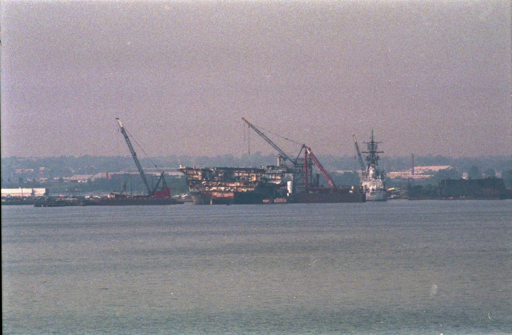 146k | August 13, 1993 — Ex-Coral Sea had arrived at Fairfield on July 5, 1993, and scrapping at this point was minimal: only a few "test cuttings" had been done. The mast parts seen on deck had been cut off in Norfolk. |