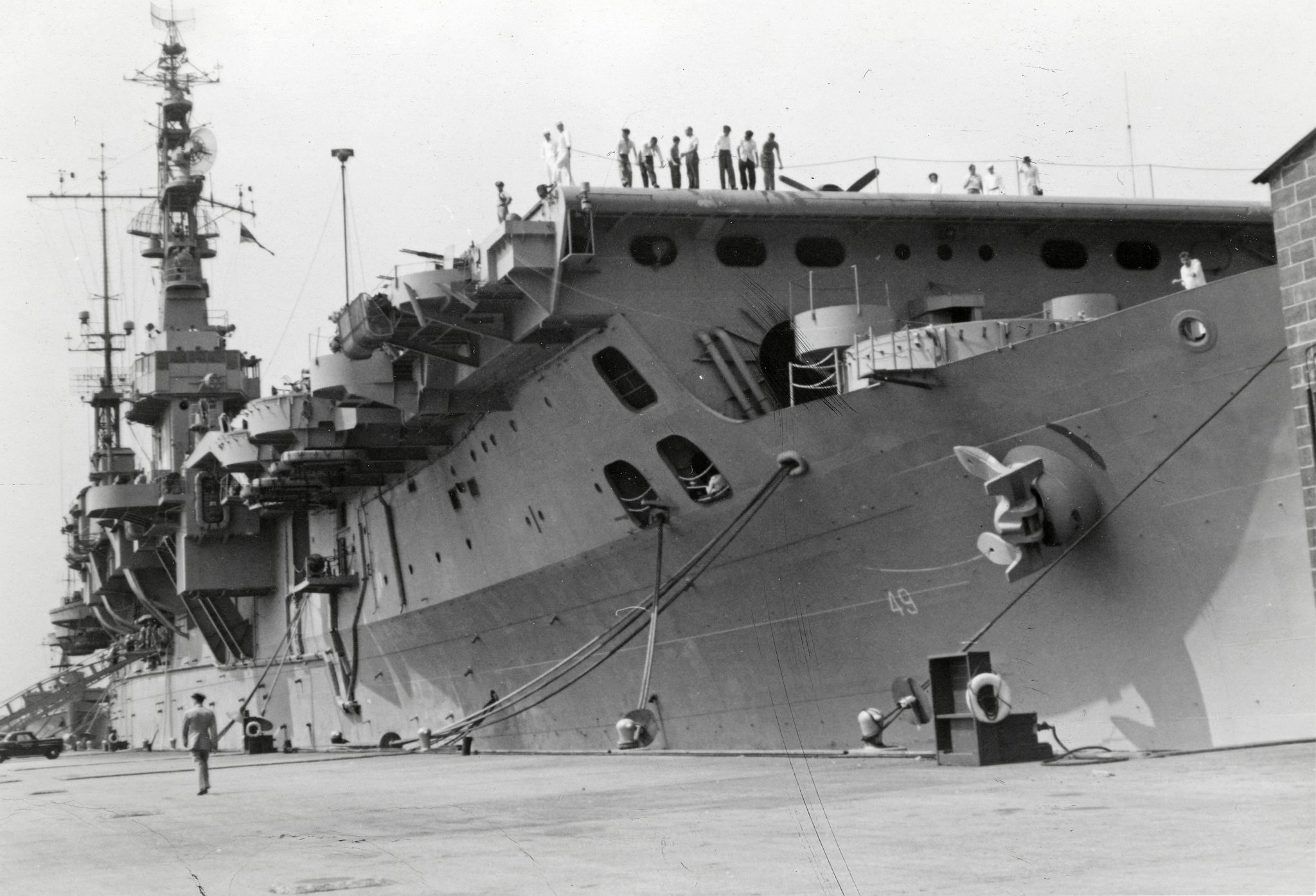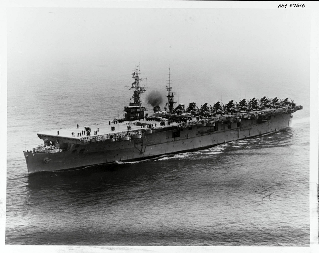 27k | An aerial port side view of the crew manning the rails, 1968. | Karl Priest | |