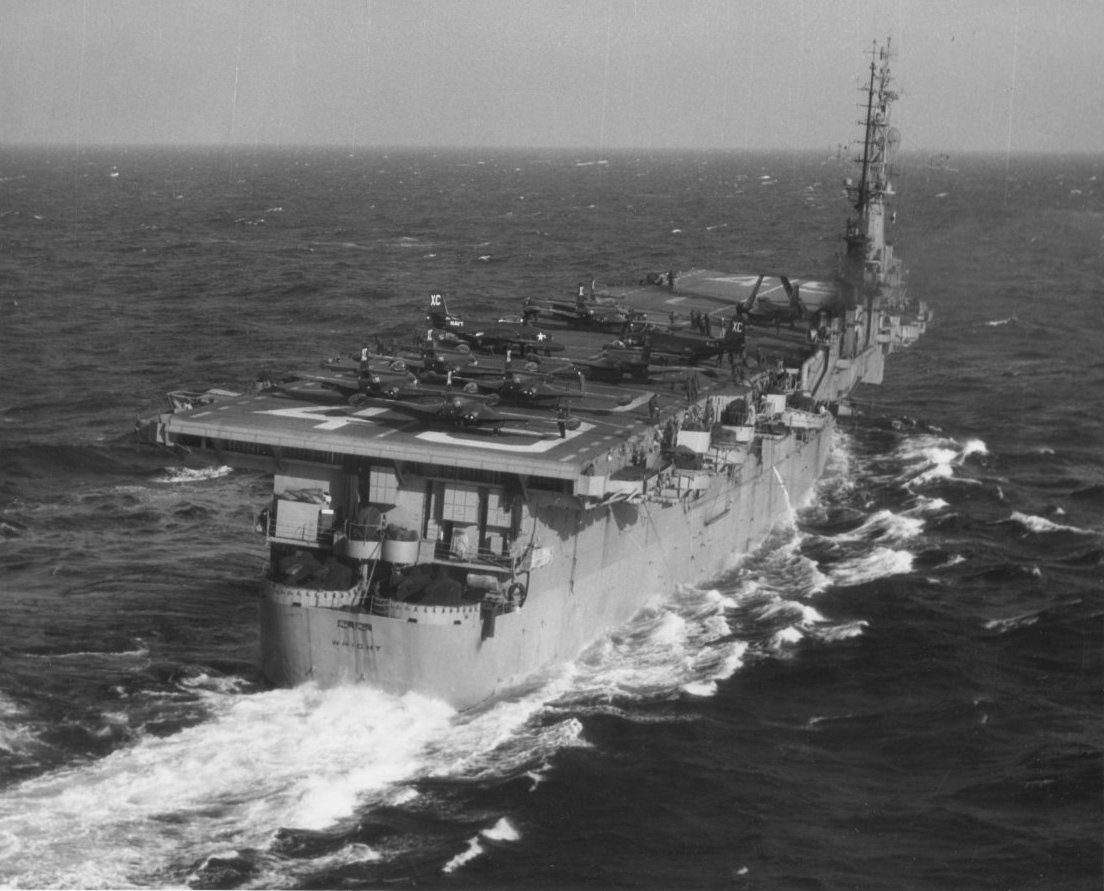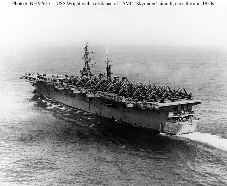106k | USS Wright (CVL-49) underway circa the mid-1950s, with about eighteen U.S. Marine Corps AD Skyraider aircraft parked on her flight deck. Official U.S. Navy Photograph, from the collections of the Naval History & Heritage Command (# NH 97617). |