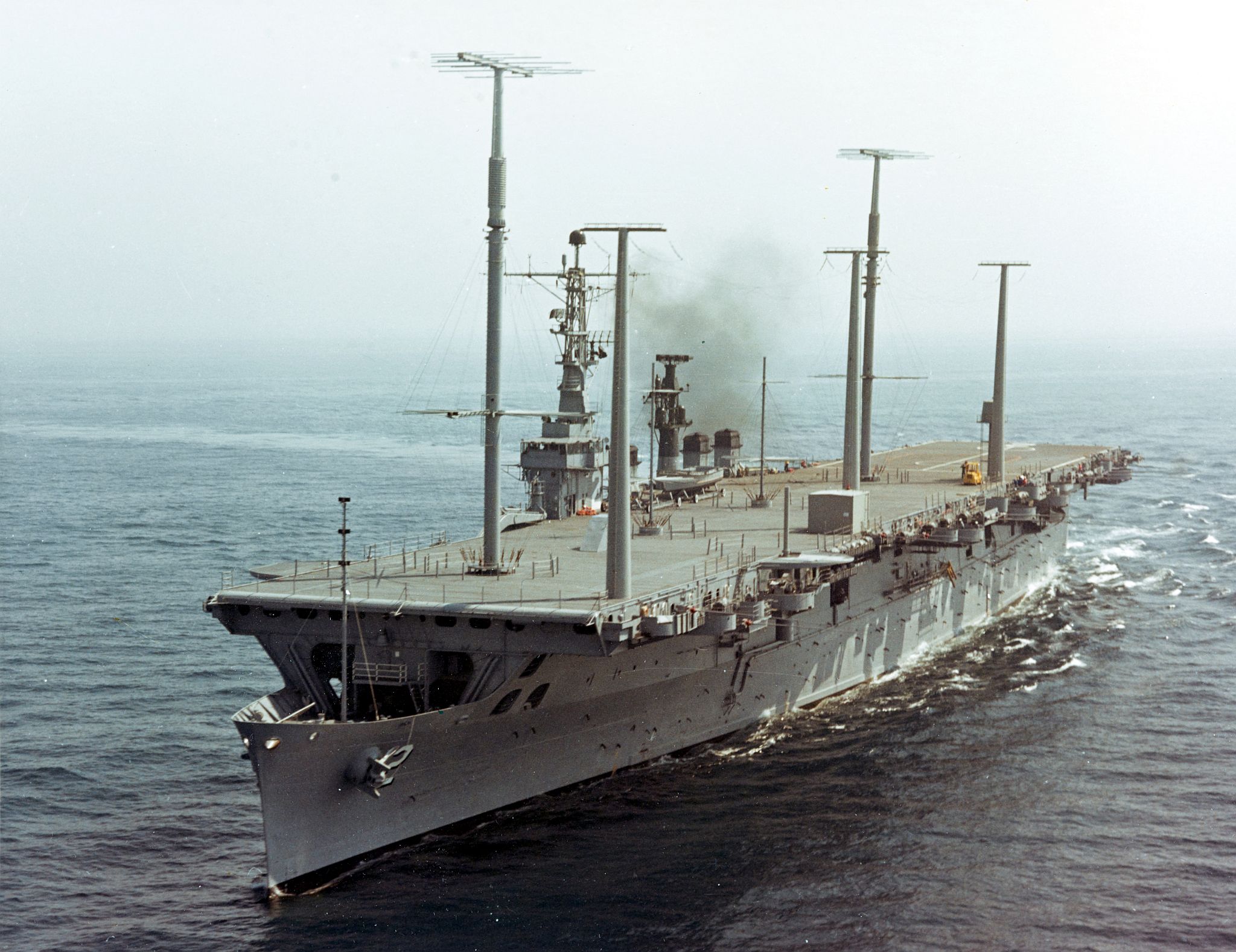 87k | USS Wright (CC-2) underway, 17 June 1963. Note the extensive array of large communications antennas installed on the ship's former flight deck. Official U.S. Navy photograph, from the collections of the Naval History & Heritage Command, (# NH 97621). |