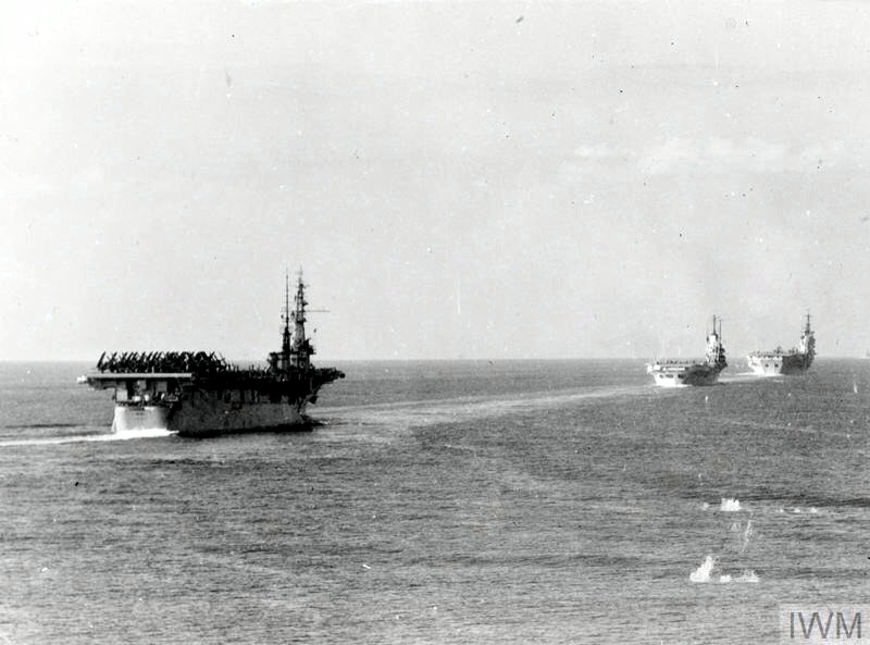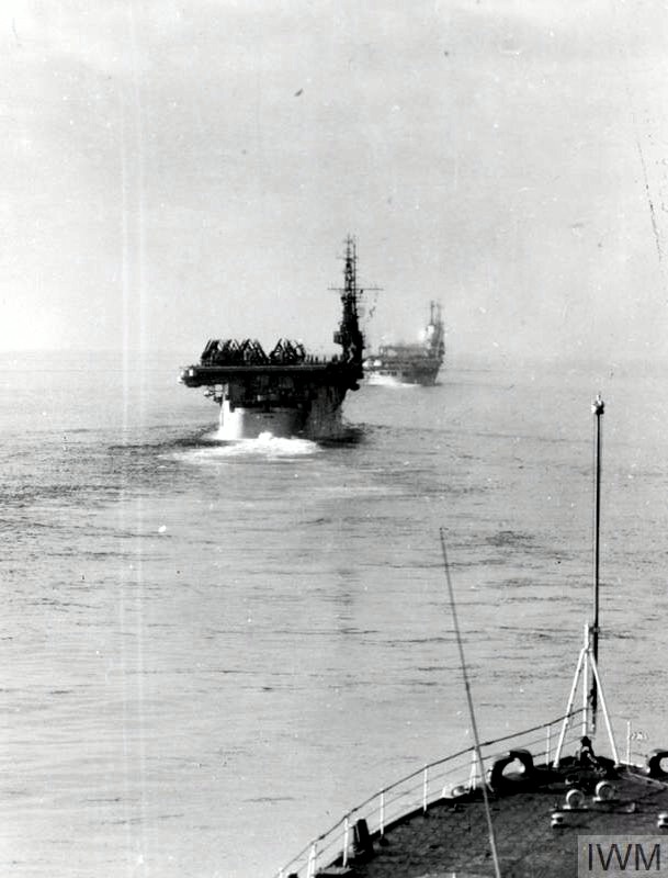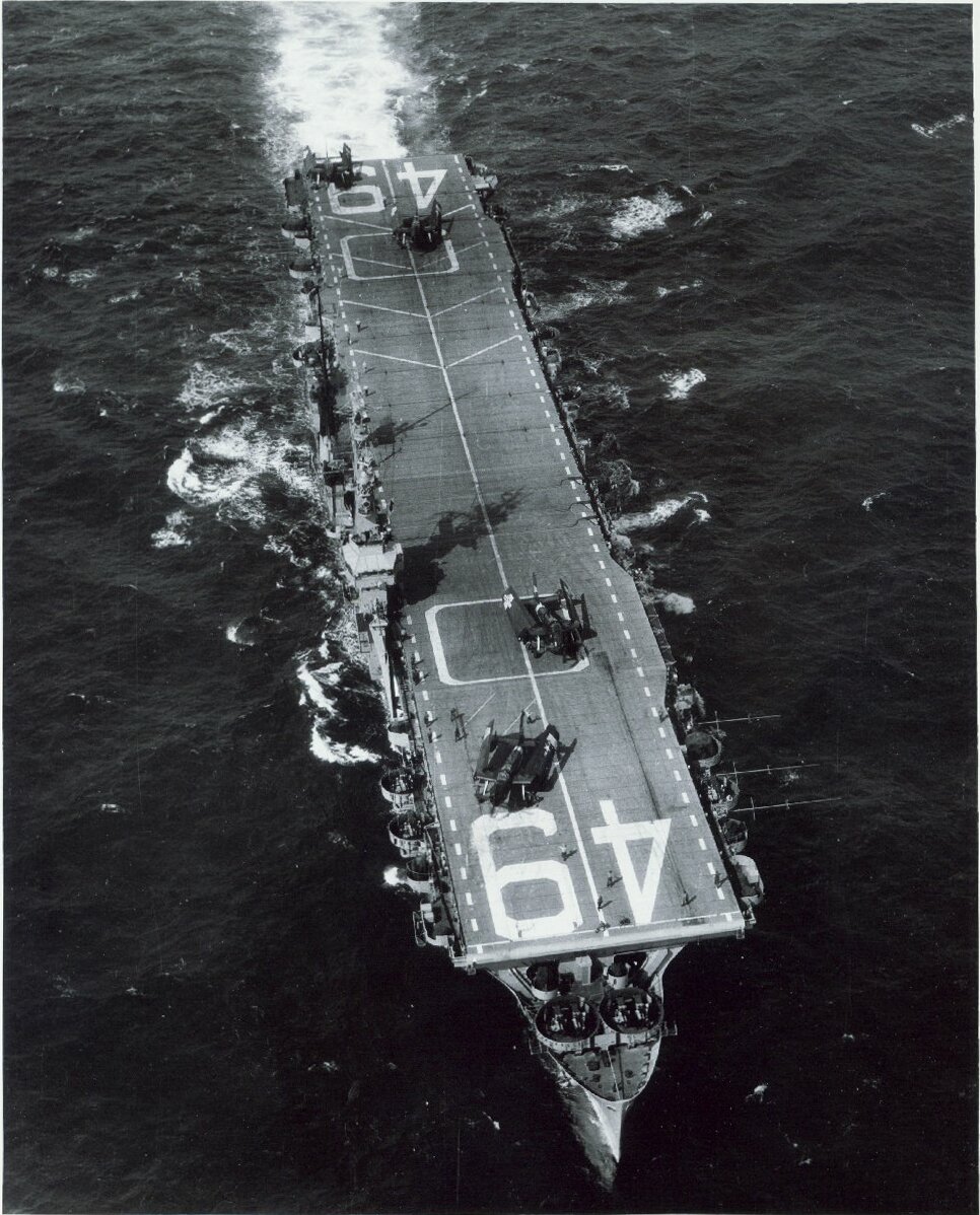 81k | As seen from HMS Vanguard (23), the photo shows a stern view of USS Wright (CVL-49) and two Royal Navy aircraft carriers, HMS Illustrious (87) and HMS Eagle (R05), steaming in line ahead formation in the North Sea after leaving the Clyde. The carriers were participating in the September 1952 Operation Mainbrace. Wright has Chance-Vought Corsair aircraft ranged on her flight deck. Eagle was leading the formation and is almost obscured by Illustrious. Imperial War Museums photo, © IWM (A 32285). |