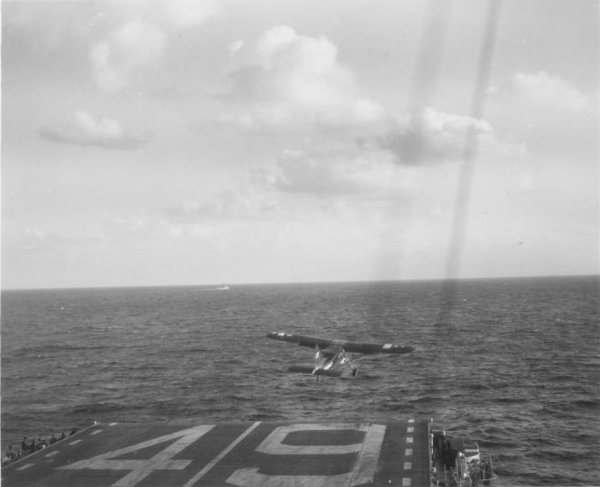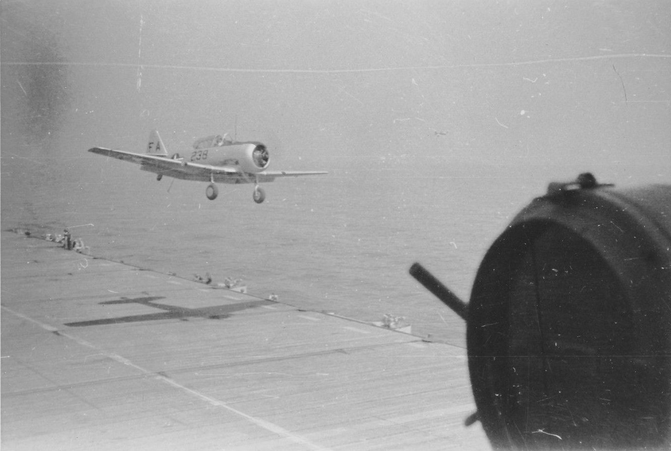 130k | SNJ Texan trying to recover aboard USS Wright (CVL-49)—note extended tailhook. This photo may be related to the picture above and to this series of images. |