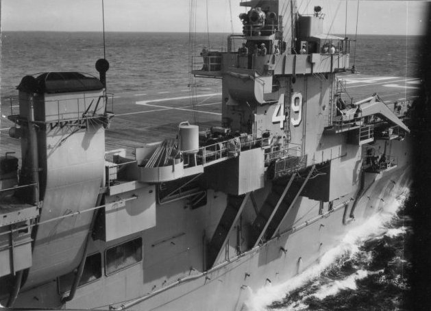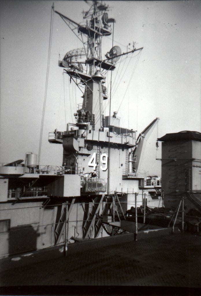 105k | USS Wright (CVL-49) island structure, as seen from USS Cabot (CVL-28), during operations at Guantánamo Bay, Cuba, circa 1951–52. US Navy and Marine Corps Museum/Naval Aviation Museum, photo # 1992.025.003. |