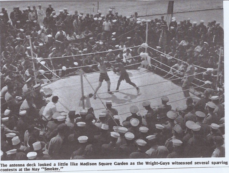 117k | "The antenna deck looked a little like Madison Square Garden as the Wright-Guys witnessed several sparring contests at the May 'Smoker.'" Scanned from the ship's magazine. | Karl Priest | |