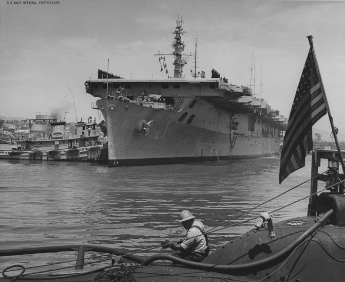 1.40M | Carriers USS Wright (CVL-49) and USS Leyte (CV-32)—with Carrier Air Group (CVG) 3—moored at Naval Air Station (NAS) Quonset Point, Rhode Island, circa 1950. US Navy and Marine Corps Museum/Naval Aviation Museum, Photo No.1996.488.195.006. Robert L. Lawson Photograph Collection. |