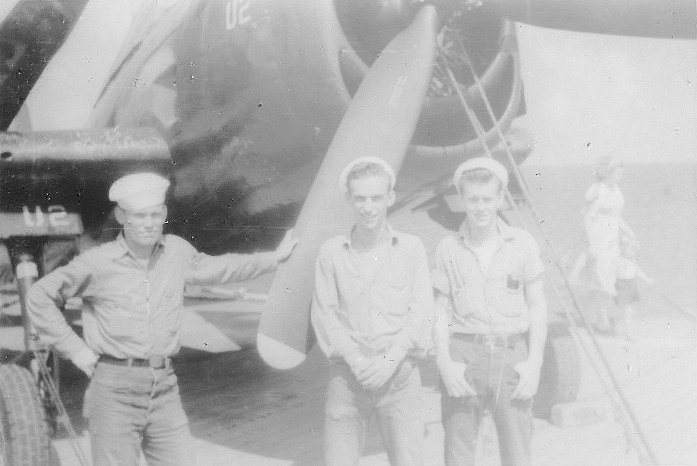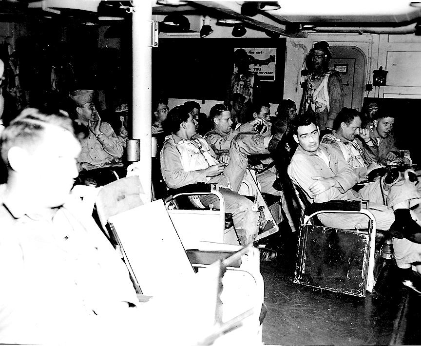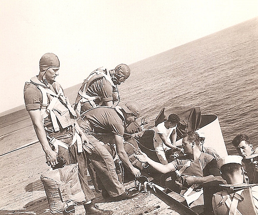 427k | Some photos of LCDR Robert D. Cosgrove's squadron, VS-822, on a two-week training duty from NAS New Orleans aboard USS Wright (CVL-49), in August 1950. ACDUTRA (ACtive DUty TRAining) aircrewmen after a mission. |