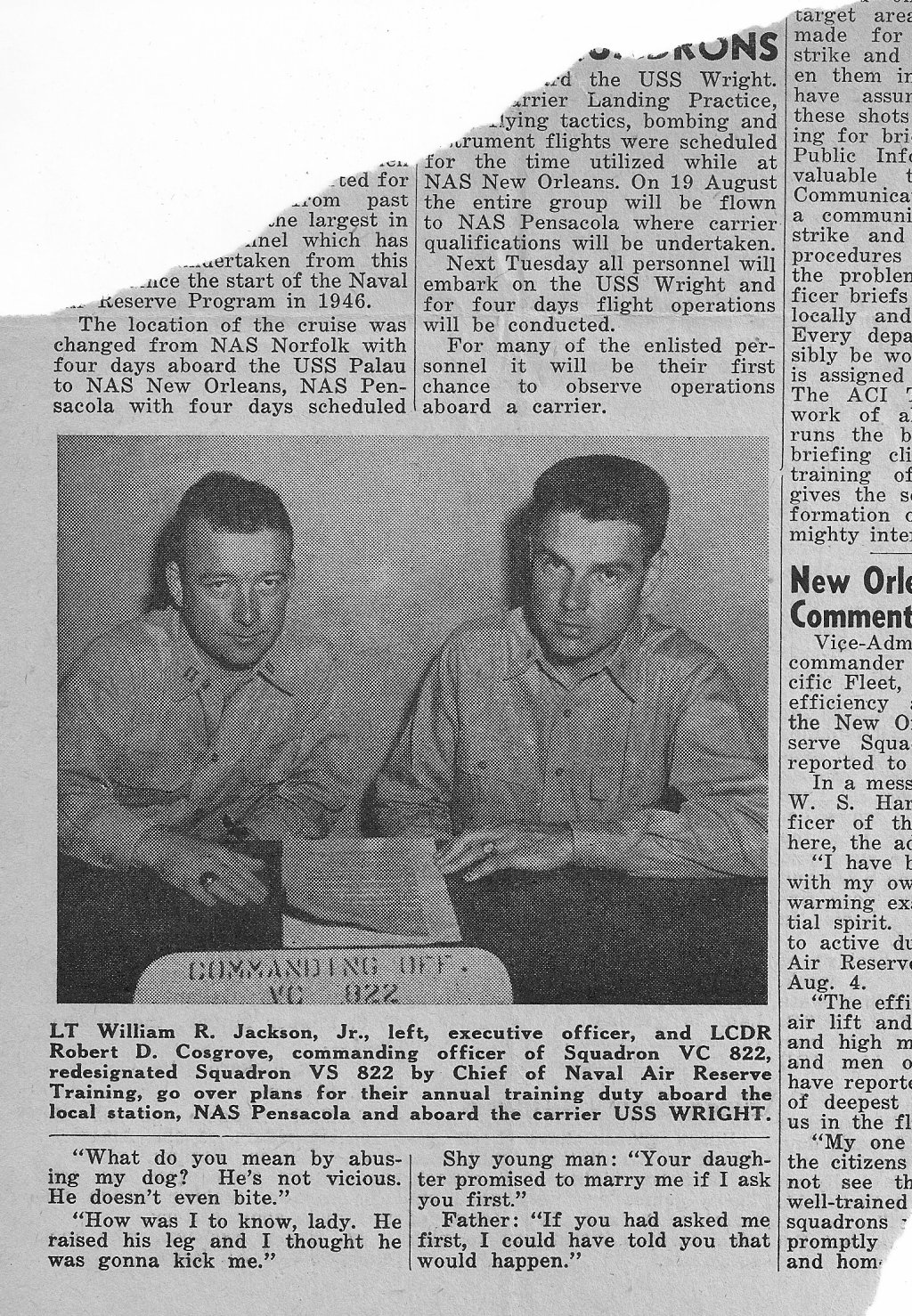 582k | "LT William R. Jackson, Jr., left, executive officer, and LCDR Robert D. Cosgrove, commanding officer of Squadron VC 822, redesignated Squadron VS 822 by Chief of Naval Air Reserve Training, go over plans for their annual training duty aboard the local station, NAS Pensacola and aboard the carrier USS Wright." |